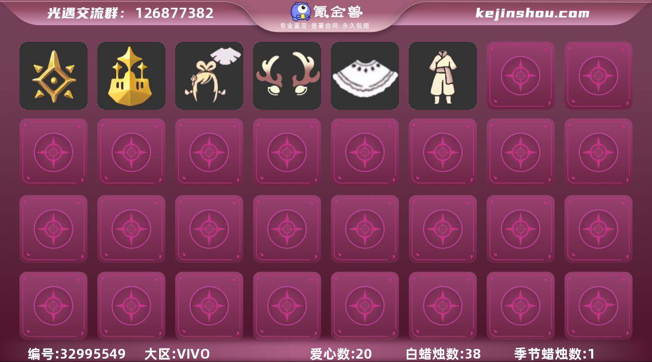 ,区服:VIVO服,登入方式:手机【5季卡】阿努比斯正太头虚荣发型彩虹武士裤鹿角绊爱王子围巾大铁头秋千,蜡烛数量:38,爱心:20,当前身高0.393,最高身高0.160,最矮身高12.160,已经毕业地图:晨岛,雨林,霞谷,暮土,已经毕业季节:梦想季,预言季,稀有礼包:彩虹武士裤,彩虹耳饰,日光耳环,圣诞鹿角,绊爱套装,大桔大利,tgc,创始人礼包,小王子围巾,白雪斗篷,暖冬瑞雪,狐狸背包,情人秋千,夏日冲浪,中国绊爱大铁头,周年庆抱枕,冥龙套装,活力海牛套装,水母帽礼包,缤纷飘带斗篷,热门物品:阿努比斯,蝴蝶结,正太头,搓澡巾,武士裤,白棉裤,花环头饰,宴会围巾,虚荣发型,红耳机,黄鼠狼面具,红狐狸面具,红金斗篷,白鸟斗篷,高音钢琴,笛子,雨伞