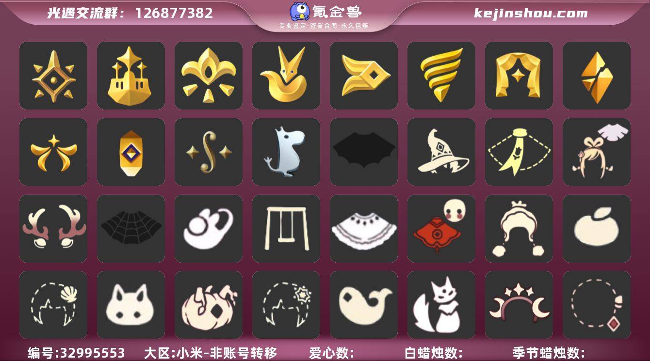 区服:小米服登入方式:手机蜡烛数量:327爱心:69最高身高0.0396最矮身高12.0396已经毕业地图:晨岛,云野,雨林,霞谷,暮土,禁阁已经毕业季节:姆明季,二重奏季,追忆季,欧若拉季,破晓季,表演季,潜海季,风行季,王子季,集结季,梦想季,预言季 稀有礼包:星月头冠,彩虹耳饰,彩虹耳机,圣诞鹿角,鲤鱼龙门,贝壳,雪花发卡,玉兔,大桔大利,四叶草头饰,玉兔拖鞋,雪人暖心靴,多彩绒绒帽,巫师帽,南瓜头,绊爱套装,小王子围巾,新春福娃,蜘蛛斗篷,蝙蝠斗篷,白雪斗篷,情人秋千,皮皮猫,冥龙南瓜热门物品:阿努比斯,蝴蝶结,公主头,正太头,樱花头,猫猫头,搓澡巾,武士裤,白棉裤,背带裤,花环头饰,宴会围巾,虚荣发型,红耳机,黄鼠狼面具,红狐狸面具,花瓣斗篷,灯泡斗篷,红金斗篷,白金斗篷,白鸟斗篷,吉他,尤克里里,高音钢琴,笛子,排箫,铃铛,雨伞