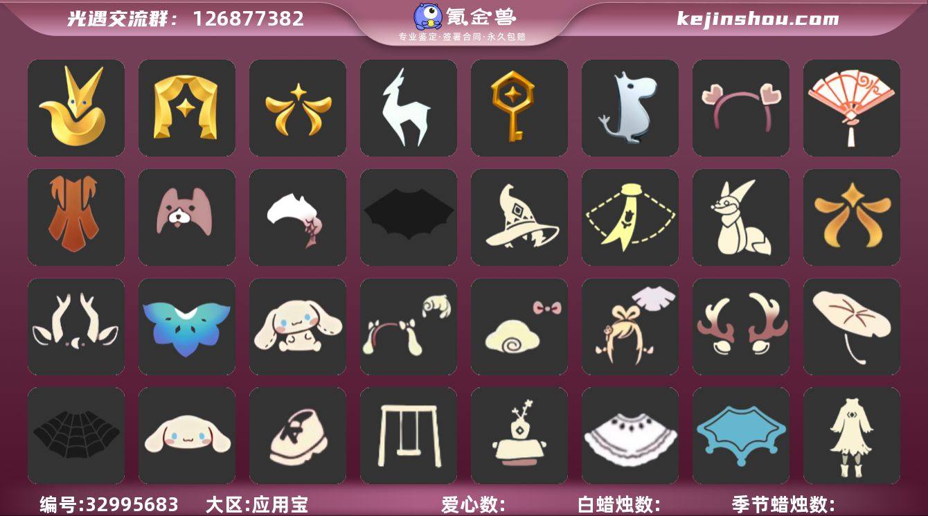 区服:应用宝登入方式:QQ蜡烛数量:314爱心:440当前身高0.831最高身高0.780最矮身高12.780已经毕业地图:晨岛,云野,雨林,霞谷,暮土,禁阁已经毕业季节:姆明季,筑巢季,九色鹿季,欧若拉季,表演季,王子季'半集结季'半风行季'半潜海季'半破晓季'半追忆季'半二重奏季'有夜行季卡稀有礼包:疯女巫长裙,祥云瑞气服饰,彩虹武士裤,跃动跑鞋,星月头冠,神鹿祝福头饰,彩虹耳饰,彩虹耳机,金鳞耳坠,巫术犄角,圣诞鹿角,奔离远行发型,鲤鱼龙门,多彩绒绒帽,蛛网朋克,巫师帽,南瓜头,绊爱套装,海蓝波浪发型,雪花发卡,大桔大利,年年有余,四叶草头饰,大耳狗装扮,迷你大耳狗发饰,小狗周年头饰,心心相印发饰,tgc,创始人礼包,小王子围巾,AURORA 之翼,臣服斗篷,新春福娃,皮皮猫装扮,蜘蛛斗篷,蝙蝠斗篷,白雪斗篷,暖冬瑞雪,异彩莲花斗篷,风之旅人礼包,大耳狗服饰,音韵吉他,欧若拉之声,祥云瑞气纸伞,荷叶伞,凯旋提琴,献瑞折扇礼包,狐狸背包,情人秋千,情人小船,茶桌,皮皮猫,冥龙南瓜,大耳狗抱枕热门物品:蝴蝶结,公主头,正太头,樱花头,猫猫头,搓澡巾,武士裤,白棉裤,背带裤,花环头饰,宴会围巾,虚荣发型,红耳机,黄鼠狼面具,红狐狸面具,花瓣斗篷,灯泡斗篷,红金斗篷,白金斗篷,白鸟斗篷,吉他,高音钢琴,笛子,铃...
