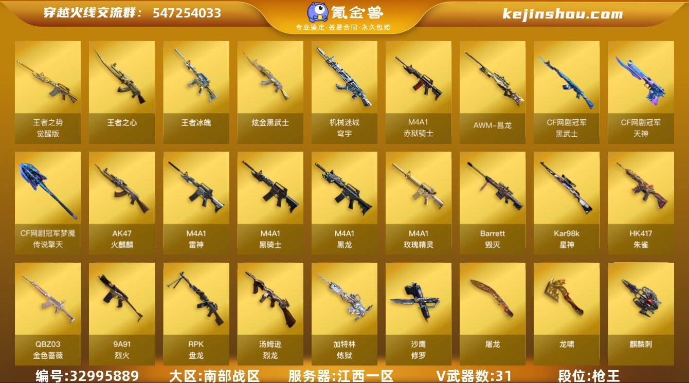 【ky6749】江西一区-35V-5王者武器数-1炫金武器数 【热门武器】:QBZ03-金色蔷薇,HK417-朱雀,Kar98K-星神,M4A1-黑骑士*2,汤姆逊-烈龙*3,RPK-盘龙,加特林-炼狱,沙鹰-修罗*5 【王者炫金武器】:王者冰魄,王者之心*2,王者之魄闪光弹,炫金武士 【皮肤】:火麒麟-心动糖果 【角色】:零,樱,战地猎狐,王者-魅影,云海玲珑,风暴女,灵动武士,斯沃特-X,铁骑荣耀 【人偶武器】:迷你深渊冰龙*4,迷你裂空之翼 【暴走生化】:超级对讲机 【挑战大师】:致命乱世-超越Max,冰龙粉碎者-白马银枪,激光毁灭者III,神圣爆裂者-末日III 【英雄级武器】:AK47-火麒麟*2,M4A1-黑龙,M4A1-雷神,M4A1-黑骑士*2,HK417-朱雀,M4A1-玫瑰精灵,QBZ03-金色蔷薇,9A91-烈火,王者之势-觉醒版,AK-47-猩红传说,黑武士-CF网剧冠军,机械迷城-穹宇,Barrett-毁灭,Kar98K-星神,RPK-盘龙,加特林-炼狱,汤姆逊-烈龙*3,沙鹰-修罗*5,天神-CF网剧冠军,屠龙,龙啸,擎天,麒麟刺,擎天-CF网剧冠军,M4A1-赤狱骑士,AWM-昌龙 【其他武器】:源-千变,源·火麒麟*2,魂·火麒麟-百城,源·雷神,魂·雷神-诺拉,御·雷神-烈虎,魂·黑骑士-现代金属,源·超新星,源-金色蔷薇,源·天龙,魂·天龙-...