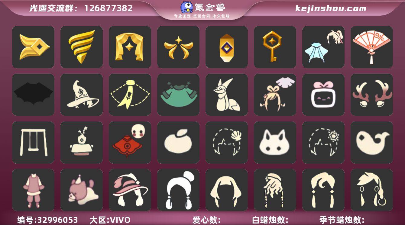 区服:VIVO服登入方式:手机蜡烛数量:162爱心:12当前身高9.915最高身高1.438最矮身高13.438已经毕业地图:晨岛,云野,雨林,霞谷已经毕业季节:筑巢季,追忆季,欧若拉季,表演季,潜海季,风行季'半青鸟季稀有礼包:祥云瑞气服饰,彩虹耳饰,圣诞鹿角,鲤鱼龙门,巫师帽,南瓜头,绊爱套装,贝壳,雪花发卡,玉兔,大桔大利,小王子围巾,星球夹克,新春福娃,蝙蝠斗篷,青衫落拓礼包'献瑞折扇礼包,狐狸背包,情人秋千,茶桌,冥龙南瓜,中国绊爱大铁头热门物品:蝴蝶结,公主头,正太头,樱花头,猫猫头,搓澡巾,武士裤,白棉裤,背带裤,花环头饰,宴会围巾,虚荣发型,红耳机,黄鼠狼面具,花瓣斗篷,灯泡斗篷,红金斗篷,白金斗篷,白鸟斗篷,吉他,高音钢琴,笛子,雨伞