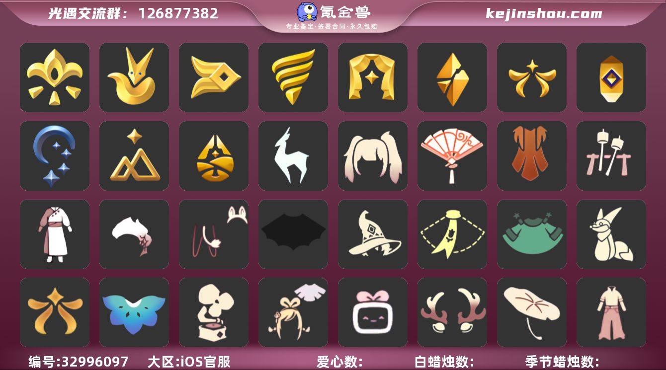 区服:国服ios登入方式:手机蜡烛数量:684爱心:51最高身高:1.793最矮身高:13.793已经毕业地图:晨岛,云野,雨林,霞谷,暮土,禁阁已经毕业季节:九色鹿季,归巢季,拾光季,夜行季,追忆季,欧若拉季,破晓季,表演季,潜海季,风行季,王子季,集结季'半姆明季稀有礼包:疯女巫长裙,奔离远行服饰,献给爱的裙装,祥云瑞气服饰,园丁装扮,彩虹武士裤,阔腿牛仔裤,肯德基联动,龙鳞束身长袍,玉兔拖鞋,跃动跑鞋,夏日凉鞋,雪人暖心靴,时尚火焰墨镜,时尚爱心墨镜,吸蟹伯爵面具,星月头冠,神鹿祝福头饰,彩虹耳饰,彩虹耳机,金鳞耳坠,日光耳环,巫术犄角,圣诞鹿角,优雅领结,水母肩饰,姆明饰品套装,奔离远行发型,温暖绒帽,鲤鱼龙门,多彩绒绒帽,蛛网朋克,巫师帽,南瓜头,绊爱套装,渐变双马尾发型,贝壳,雪花发卡,玉兔,大桔大利,年年有余,四叶草头饰,夏日有友,tgc,创始人礼包,小王子围巾,星球夹克,AURORA 之翼,臣服斗篷,新春福娃,海龟斗篷,皮皮猫装扮,蜘蛛斗篷,蝙蝠斗篷,保暖雪人斗篷,白雪斗篷,暖冬瑞雪,粽子,蛛丝斗篷, 吸蟹伯爵斗篷,飞蛾装扮,文雀装扮,暖冬夹棉斗篷,异彩莲花斗篷,盘龙围巾斗篷,浪漫流星斗篷,雏鸟之琴,音韵吉他,周年庆吉他,凯旋手碟,欧若拉之声,惊喜手杖,灯笼,阳伞,祥云瑞气纸伞,荷叶伞,凯...