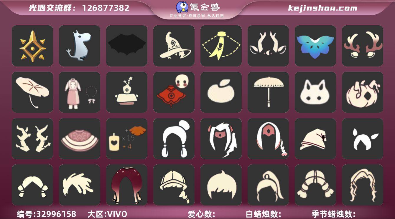 区服:VIVO服登入方式:手机蜡烛数量:66爱心:6当前身高2.230最高身高2.030最矮身高14.030已经毕业地图:晨岛,霞谷已经毕业季节:姆明季'预言季'半潜海季'半破晓季'稀有礼包:肯德基联动,神鹿祝福头饰,巫术犄角,圣诞鹿角,巫师帽,南瓜头,玉兔,大桔大利,创始人礼包,小王子围巾,新春福娃,蝙蝠斗篷,暖冬夹棉斗篷,异彩莲花斗篷,阳伞,荷叶伞,花憩茶几,冥龙南瓜热门物品:阿努比斯,正太头,樱花头,猫猫头,武士裤,白棉裤,花环头饰,虚荣发型,白金斗篷,高音钢琴,铃铛,雨伞