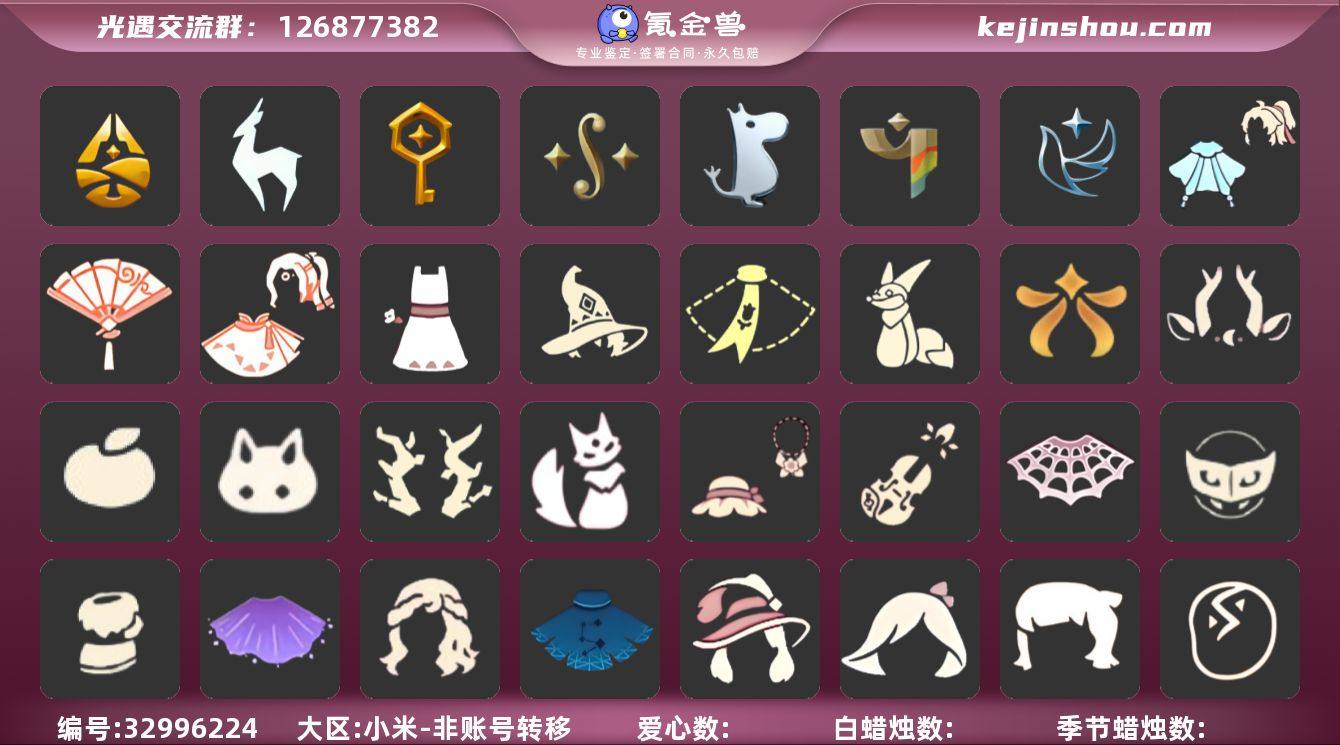 区服:小米服'登入方式:手机'蜡烛数量:236'爱心:81'最高身高1.600'最矮身高13.600'已经毕业地图:晨岛,云野,雨林,霞谷,暮土,禁阁'已经毕业季节:青鸟季,彩染季,姆明季,二重奏季,筑巢季,九色鹿季,归巢季'有双星季卡'稀有礼包:向日葵连衣裙,雪人暖心靴,神鹿祝福头饰,巫术犄角,姆明饰品套装,巫师帽,海蓝波浪发型,玉兔,大桔大利,夏日有友,小王子围巾,AURORA 之翼,暖冬瑞雪,蛛丝斗篷,浪漫流星斗篷,周年线框斗篷,衔福献瑞礼包,凯旋提琴,献瑞折扇礼包,狐狸背包'玫瑰褶边斗篷'皮皮猫'青衫落拓礼包'热门物品:蝴蝶结,公主头,正太头,樱花头,猫猫头,搓澡巾,武士裤,白棉裤,花环头饰,宴会围巾,虚荣发型,红耳机,黄鼠狼面具,花瓣斗篷,灯泡斗篷,红金斗篷,白金斗篷,白鸟斗篷,吉他,尤克里里,高音钢琴,笛子,雨伞