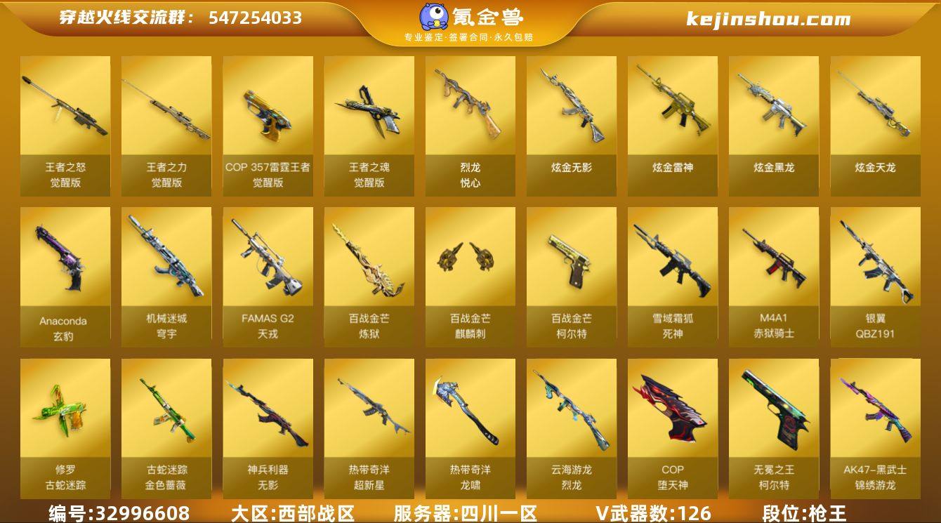 【ky6745】四川一区-135V-5王者武器数-4炫金武器数 【热门武器】:G36C-幻影,QBZ03-金色蔷薇,M200-幻神,金色蔷薇-古蛇迷踪,修罗-古蛇迷踪,白虎-电玩蓝兔,Kar98K-星神,M4A1-黑骑士*2,汤姆逊-烈龙*6,RPK-盘龙*5,加特林-炼狱*2,斯泰尔-蝴蝶,USP-雷暴,COP-堕天神,沙鹰-修罗*4 【王者炫金武器】:烈龙-悦心,炫金无影,炫金黑龙,炫金雷神,炫金天龙 【音效卡】:QBZ03-天罚音效卡,烈龙-云海游龙音效卡,屠龙-电竞之星-竞星跃动音效卡,M200-幻神音效卡,AK47-火麒麟音效卡,M4A1-雷神音效卡,M4A1-黑骑士音效卡,Barrett-毁灭音效卡,HK417-朱雀-电竞之星-竞星跃动音效卡,Barrett-碧霄极光音效卡,炼狱-百战金芒-庆典舞曲音效卡,死神-雪域霜狐-怀旧音效卡 【皮肤】:幻神-丹凤,幻神-CFS2022,幻神-电流骇客 皮肤,幻神-AG-CFPL S24冠军 皮肤,幻神-电竞之星 皮肤,白虎-白鲨-CFPLS23冠军,QBZ03-AG-CFPLS19冠军,金色蔷薇-量子蔷薇 皮肤,金色蔷薇-电竞之星 皮肤,裁决-流光秘银,裁决-巅峰荣耀 皮肤,裁决-叶芒苍灵 皮肤,Kar98K-星神-冠军之星皮肤,星神-美杜莎 皮肤,雷神-暗月,雷神-能量核心,雷神-星空,雷神-杨戬,雷神-R.LGD-CFPLS18冠军,雷神-宇航兔...