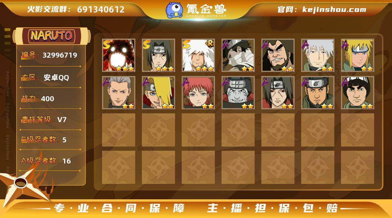 【HYC1695】V7/战力400W/S忍5/A忍16/三星S-漩涡鸣人 「暴怒·第六尾」/三星S-自来也「舞之豪杰」/二星A-桃地再不斩「秽土转生」/二星A-宇智波鼬/二星A-迈特凯/二星A-蝎/二星A-飞段/二星A-神农 「羁绊」/二星A-猿飞阿斯玛/二星A-旗木卡卡西 「幻之真容」/二星A-迪达拉/二星A-干柿鬼鲛/三星S-宇智波鼬 「须佐能乎」/二星A-波风水门 「青年」