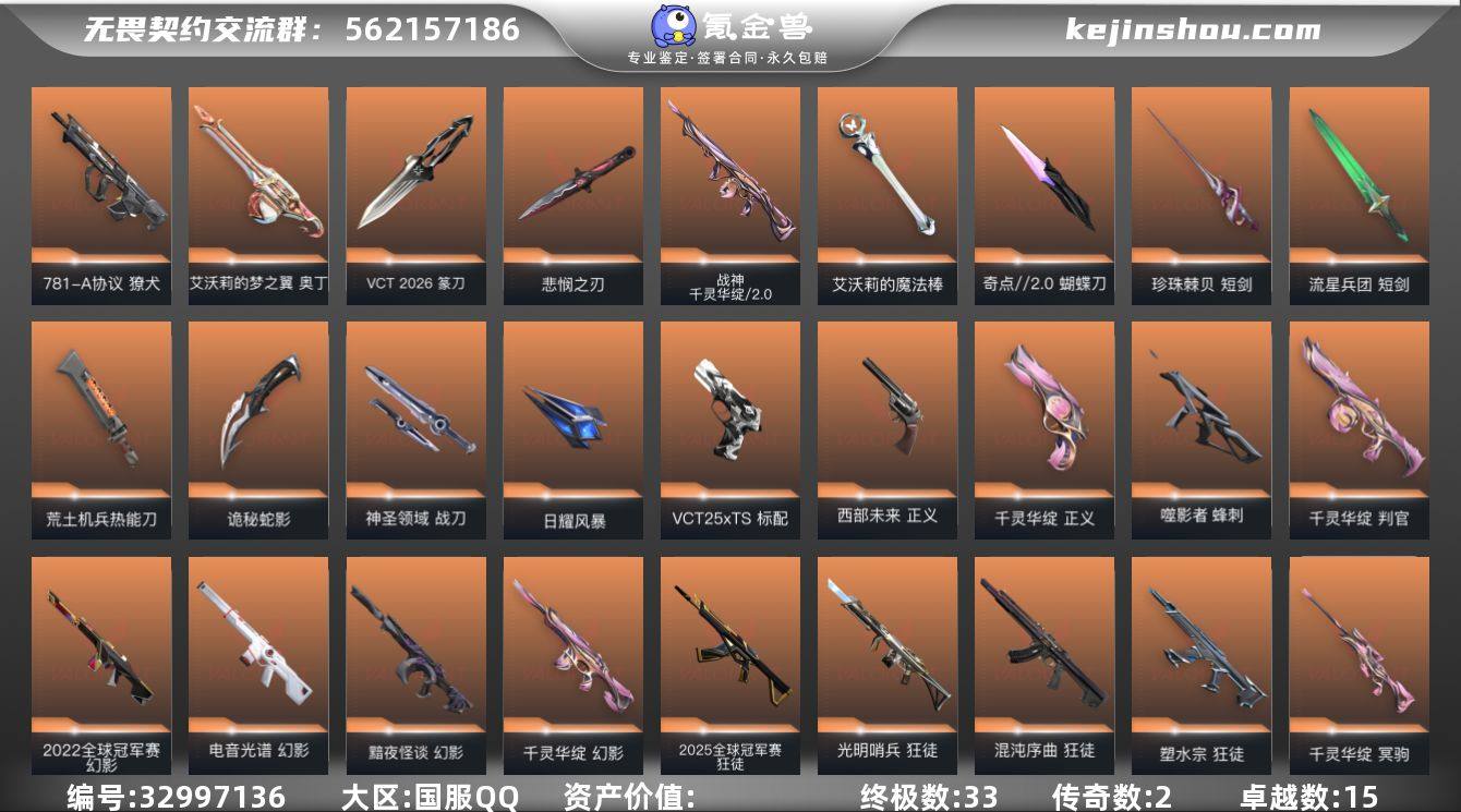 【套装】:W15838 可立即换绑无需挂单养号 VCT 2026 赛季套装,无畏契约季前邀请赛套装,千灵华绽套装,神中神罚套装 【英雄】:幻棱,炼狱,维斯,暮蝶,钛狐,壹决,铁臂,捷风,雷兹,幽影,不死鸟,贤者,猎枭,蝰蛇,零,芮娜,奇乐,尚勃勒,霓虹,斯凯,夜露,星礈,K/O,海神,盖可,黑梦,钢锁 【近战武器】:近战武器-碎心裂刃,近战武器-VCT 2026 篆刀,近战武器-无畏契约季前邀请赛 悲悯之刃,近战武器-神之刃,近战武器-奇点//2.0 蝴蝶刀,近战武器-紫金爪刀,近战武器-落英飞旋,近战武器-镭切,近战武器-艾沃莉的魔法棒,近战武器-珍珠棘贝 短剑,近战武器-流星兵团 短剑,近战武器-荒土机兵 热能刀,近战武器-诡秘蛇影 军刀,近战武器-神圣领域 战刀,近战武器-日耀风暴 遗器 【狂徒】:狂徒-2025全球冠军赛,狂徒-光明哨兵,狂徒-混沌序曲,狂徒-塑水宗,狂徒-般若假面//2.0,狂徒-日冕雄师,狂徒-离子武器//2.0,狂徒-荒土机兵,狂徒-流星兵团,狂徒-诡秘蛇影 【幻影】:幻影-2022全球冠军赛,幻影-黯夜怪谈,幻影-千灵华绽,幻影-电音光谱,幻影-神中神罚,幻影-珍珠棘贝,幻影-神圣领域,幻影-纳米打击,幻影-末日之翼,幻影-电音光谱 【戍卫】:戍卫-...