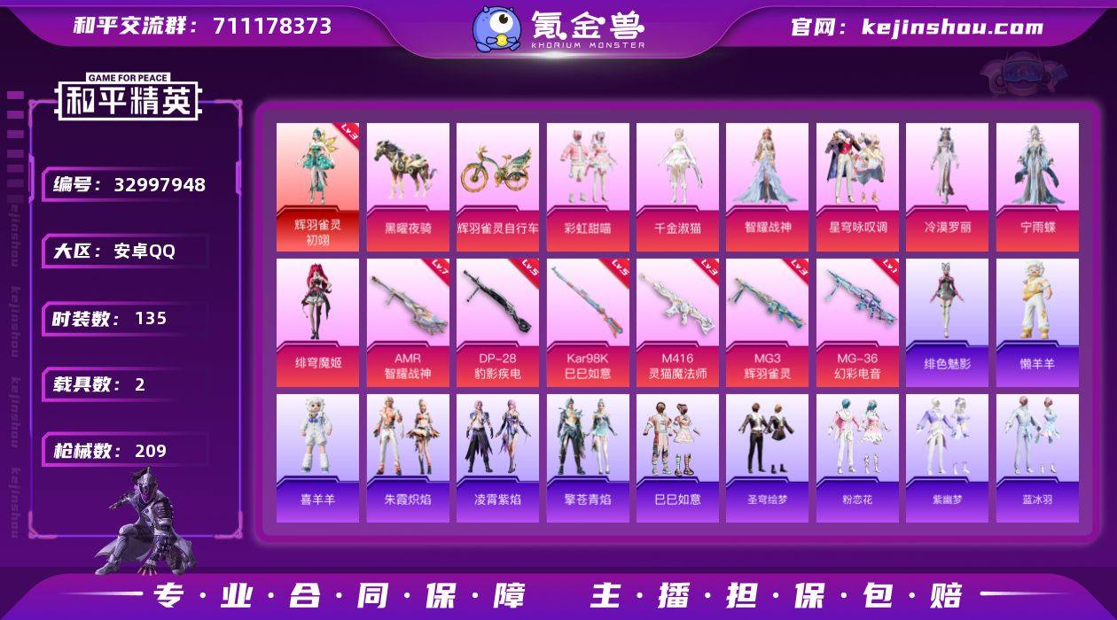 【kyhp1498】安卓 手Q-1神装-7粉装-6特效枪-2载具-9粉色飞行器-72438热力值-3王牌印记-135套装-209枪皮 【红色神装等级】:辉羽雀灵-初翊(三级) 【红色角色神装】:辉羽雀灵-初翊 【粉色套装】:粉装-彩虹甜喵,角色-千金淑猫,角色-智耀战神,粉装-星穹咏叹调,角色-冷漠罗丽,角色-宁雨蝶,角色-绯穹魔姬 【粉色枪皮等级】:M416-灵猫魔法师(三级),Kar98K-巳巳如意(五级),AMR-智耀战神(七级),DP-28-豹影疾电(五级),MG3-辉羽雀灵(三级),MG-36-幻彩电音(一级) 【粉色载具】:黑曜夜骑,辉羽雀灵自行车 【粉色枪皮】:M416-灵猫魔法师,Kar98K-巳巳如意,AMR-智耀战神,DP-28-豹影疾电,MG3-辉羽雀灵,MG-36-幻彩电音 【粉色飞行器】:炫彩糖果飞行器,星夜魔法师飞行翼,太空嘟嘟飞行器,绯果甜心飞行器,雀灵庇佑飞行器,御兔特攻飞行器,时光之吻飞行器,终晖之翼飞行器,灵猫魔法师飞行器 【粉色降落伞】:春暖花开降落伞,梦幻火箭降落伞,阿狸红降落伞,洛神天依降落伞,碧影闪光降落伞,庄周梦蝶降落伞,橘柚倾心降落伞,垂柳戏鸭降落伞,彩虹甜喵降落伞,旋转彩虹降落伞,暗夜鎏金降落伞,音爆索尼克降落伞,猪猪侠降落伞,智耀战神降落伞,圣斗士星矢降落伞,绯...
