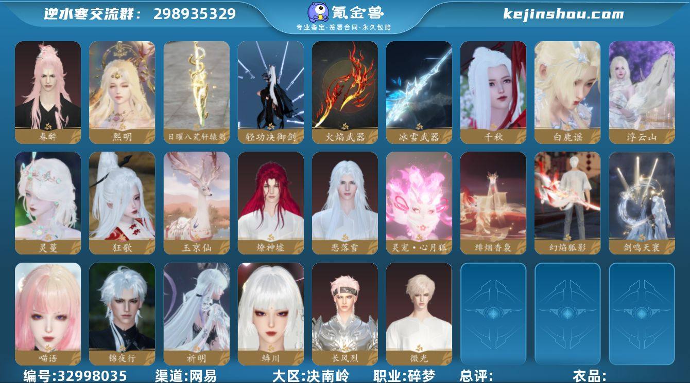 【区服】 江山如画 【战力值】 100.2 【职业】 素问 【馆藏】 7级 【衣品值】 348870 【国色值】 155280 【已用天赏石】 44 【天霓染数量】 9 【充值称号】 卧看千山 【累计充值】 56086元 【剩余赠礼额度】 158607纹玉 【天霓染】 微光*1, 长风烈*1, 澄心映光*1, 凤吟振羽*1, 晴岸涛吟*1, 金兰展虹*1, 凛刃*1, 法度禅心*1, 陆离*1 【灵韵内功】 昆吾断玉, 移星障, 俯仰太虚, 逢虚, 冲虚, 熔甲, 灭阵 【稀有道具】 浑天劫 【转盘外观】 微光, 长风烈, 星喵梦使 【副本外观】 白夜拂雪*2, 紫宿宸极, 星剑分野, 霜途无间, 飞焰流波 【天赏外观】 鳞川, 春醉, 燎神墟, 祈明, 悲落雪, 熙明, 狂歌, 锦夜行, 灵蔓, 浮云山, 喵语, 白鹿谣, 千秋, 冰雪武器, 火焰武器, 雷霆武器, 水武器, 幻焰狐影, 轻功诀御剑, 日曜八荒·轩辕剑, 绯烟香袅, 剑鸣天寰 【天赏祥瑞】 玉京仙 【祥瑞坐骑】 萌莓, 露荷, 布丁, 假面, 鸿火, 风行·江湖景, 风行·世间情, 呆宝, 风行·万灯明, 云螭·庆舞迎春, 龙衔瑞焰, 丹锦喜狮, 甜点鼠鼠, 金冠鼠鼠, 幻琉晶, 沉木行马, 星河转·银昼, 星河转·金夕, 星河转·赤夜, 骋风叱焰, 纵风甲车·赤, 贺岁喜狮, 粉黛娇, 狂霸天, 伯力, 咩郎, 瓜皮, 英杰, 阿德, 霸霸, 墨流云...