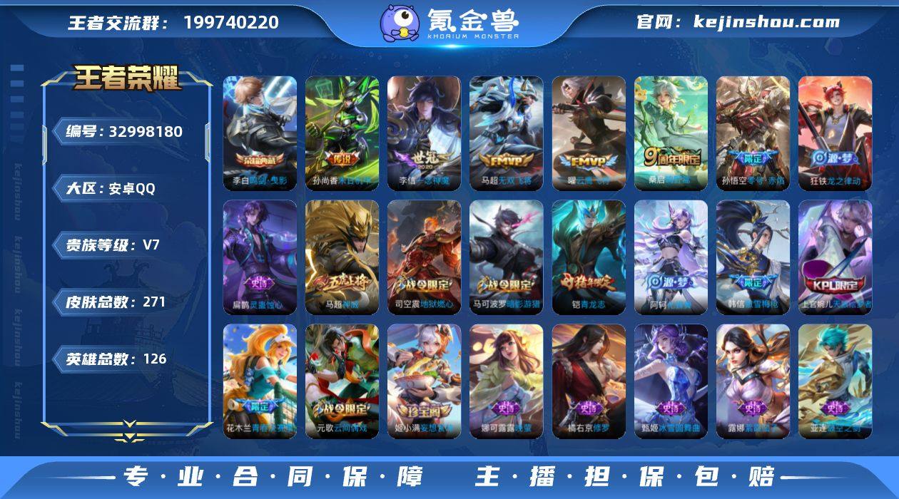 安卓Q-V7-至尊星耀IV段位-126英雄-271皮肤-1典藏皮肤-6传说-89史诗 【荣耀典藏】:李白鸣剑曳影 【传说皮肤】:桑启鸣野蒿,马超无双飞将,孙悟空零号赤焰,曜云鹰飞将,李信一念神魔,孙尚香末日机甲 【限定皮肤】:蒙犽顽岩魄,蔡文姬夏日便利店,虞姬夏日便利店,姜子牙天穹之誓,杨戬破阵退雄兵,狄仁杰阴阳师,赵云皇家上将,嬴政优雅恋人,鲁班七号狮舞东方,庄周高山流水,高渐离死亡摇滚,芈月幻夜卜梦,元歌云间偶戏,元歌无心,夏侯惇朔风刀,马可波罗暗影游猎,狄仁杰魔术师,狄仁杰万华元夜,达摩星际陆战队,达摩沙漠行僧,项羽海滩派对,老夫子醍醐杖,程咬金演武夺筹,韩信傲雪梅枪,兰陵王金庭之子,花木兰青春决赛季,亚瑟潮玩骑士王,孙悟空零号赤焰,后羿圣弓游侠,李元芳云中旅人,钟馗驱傩正仪,干将莫邪真爱魔法,雅典娜单词大作战,雅典娜黎明之约,太乙真人华丽摇滚,鬼谷子原初探秘者,黄忠火炮绅士,铠青龙志,苏烈千军破阵,百里玄策原初追逐者,弈星混沌棋,梦奇顽趣,沈梦溪大漠名商,明世隐疑决卦,裴擒虎李小龙,裴擒虎擒涛扼浪,米莱狄胡桃异想国,云中君纤云弄巧,猪八戒西部大镖客,上官婉儿梁祝,上官婉儿天狼绘梦者,嫦娥拒霜思,西施玲...