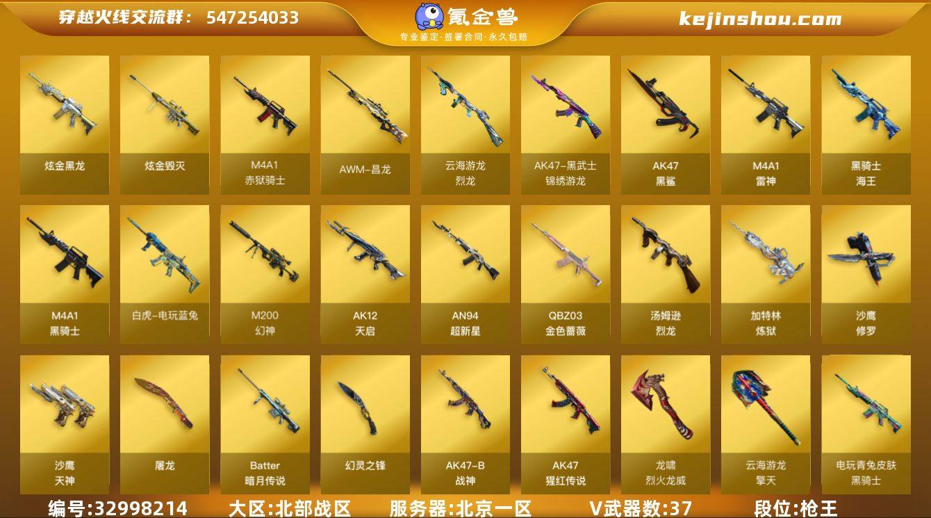 【947397】北京一区-41V-0王者武器数-2炫金武器数 【热门武器】:QBZ03-金色蔷薇,M200-幻神,死亡之眼,白虎-电玩蓝兔,M4A1-黑骑士,汤姆逊-烈龙,加特林-炼狱,沙鹰-修罗*3 【王者炫金武器】:炫金黑龙,炫金毁灭 【音效卡】:烈龙-云海游龙音效卡,屠龙-电竞之星-竞星跃动音效卡,M4A1-黑骑士音效卡,HK417-朱雀-电竞之星-竞星跃动音效卡 【皮肤】:雷神-暗月,雷神-维纳斯皮肤,雷神-航星皮肤,M4A1-雷神-新春神龙皮肤,雷神-源计划2.0专属 皮肤,火麒麟-平天大圣,火麒麟-百城,毁灭-黑大圣皮肤,黑骑士-电玩青兔皮肤,战神-粉色甜心皮肤,战神-紫绶金章皮肤,AK47-B-常胜将军-曹操,AK47-B-常胜将军-孙权,屠龙-春桃 皮肤 【角色】:鹰,战地猎狐,王者-葵-貂蝉,乔伊教练,修道士,云海玲珑,幻面灵狐,斗烈龙骑,暗夜-X,初恋灵狐,电竞少女,芳心审判者,飞虎队-X,风暴女,娟娟,兰-海滩派对,兰-新年限定,0号玩家,灵动武士,灵狐者-X,灵狐者-黄金海岸,灵狐者-七夕宝贝,龙儿,麻雀,曼陀罗-礼服,玫瑰花神,潘多拉-X,潘多拉-甜心教官,赛斯-X,蜀雪,铁骑荣耀,兔囡囡,维纳斯,雪莉杨-摸金校尉,夜玫瑰-幻能朋克,影武者-X,游珑儿 【人偶武器】:COP-旗袍...