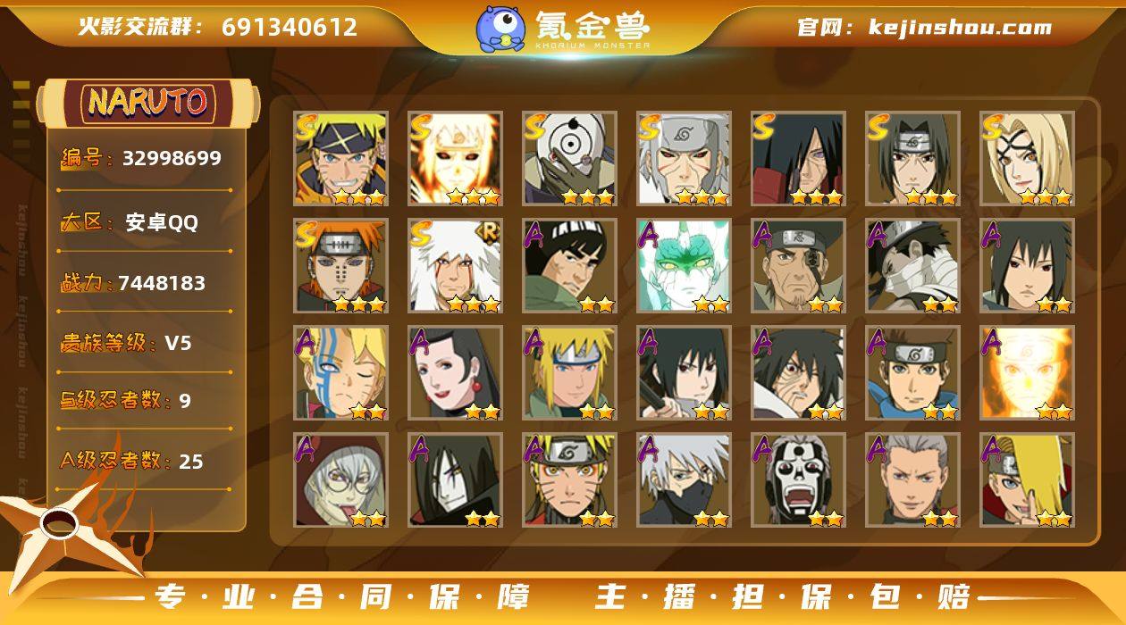 9S忍/25A忍/战力744W/V5/区服1582 【S忍者】 宇智波佐助「漩涡鸣人」,自来也「舞之豪杰」,宇智波斑「秽土转生」,宇智波斑「白面具」,千手扉间「秽土转生」,纲手「百豪」,宇智波鼬「须佐能乎」,佩恩「天道」,波风水门「九喇嘛连结」, 【A忍者】 巳月「仙人模式」,迈特凯「青春爆炸」,土台「忍界大战」,不缘,漩涡博人「桃式显现」,宇智波泉奈,桃地再不斩「秽土转生」,波风水门「青年」,宇智波佐助「须佐能乎」,宇智波带土「暴怒」,猿飞木叶丸「博人传」,漩涡鸣人「九尾查克拉」,药师兜「半蛇斗篷」,大蛇丸「晓」,漩涡鸣人「仙人模式」,旗木卡卡西「万花筒写轮眼」,飞段「死司凭血」,飞段,迪达拉,我爱罗「疾风传」,蝎,干柿鬼鲛,宇智波鼬,猿飞阿斯玛,迈特凯, PX_2541451