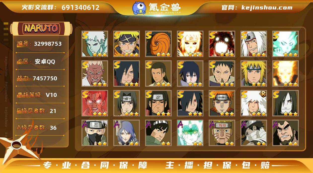 21S忍/36A忍/战力745W/V10/区服2613 【S忍者】 宇智波带土「十尾人柱力」,宇智波佐助「漩涡鸣人」,宇智波斑「五影会谈」,艾「忍界大战」,宇智波斑「秽土转生·解」,千手柱间「木叶创立」,宇智波佐助「永恒万花筒」,漩涡鸣人「九喇嘛连结」,迈特凯「死门」,宇智波斑「木叶创立」,宇智波带土「忍界大战」,千手柱间「秽土转生」,自来也「舞之豪杰」,大筒木舍人「最终章」,自来也「传说中的三忍」,漩涡鸣人「暴怒·第六尾」,宇智波鼬「须佐能乎」,佩恩「天道」,波风水门,大蛇丸,波风水门「九喇嘛连结」, 【A忍者】 宇智波带土「漂泊浪客」,小南「神驹佑将」,旗木卡卡西「神威对决」,机械鸣人「初始形态」,巳月「仙人模式」,迈特凯「青春爆炸」,日向宁次「忍界大战」,漩涡博人「桃式显现」,旗木卡卡西「幻之真容」,李洛克「忍界大战」,蝎「绯流琥」,宇智波泉奈,神农「羁绊」,桃地再不斩「秽土转生」,角都「秽土转生」,艾「青年」,达鲁伊「五代目雷影」,波风水门「青年」,宇智波止水「新春限定」,黑土「四代目土影」,宇智波佐助「须佐能乎」,宇智波带土「暴怒」,漩涡鸣人「九尾查克拉」,千代「近松十人卫」,秋道丁次「忍界大战」,大蛇丸「晓」,漩涡鸣人「仙人模式」,飞段「死司凭血...