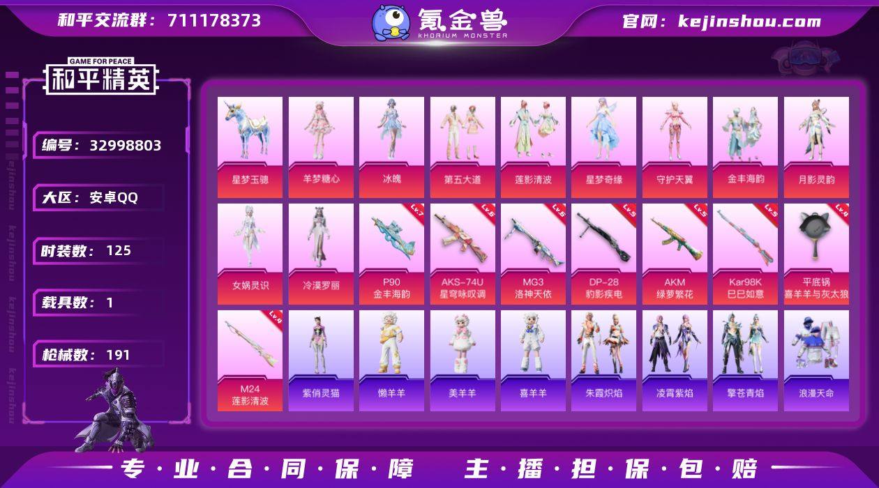 YZJ16473-可二次-安卓Q-1稀有1载具10粉装10特效枪2热门【精品公主号 多款热门新粉装 第五大道 星梦奇缘 女娲灵识 羊梦糖心 冷漠罗丽 粉雾星云 临安公主 冰公主 绛羽幽主 莱茵河畔 天命 满级P90金丰海韵 星梦奇缘背包头盔 6款飞行器】125套装191枪皮 60152热力值 9印记 历史超级王牌21星 【1稀有】 浪漫天命 【1载具】 星梦玉骢 【10粉装】 冰魄 女娲灵识 金丰海韵 月影灵韵 冷漠罗丽 守护天翼 星梦奇缘 羊梦糖心 莲影清波 第五大道 【10特效枪】 P90-金丰海韵 (7级) AKS-74U-星穹咏叹调 (6级) AKM-绿萝繁花 (5级) Kar98K-巳巳如意 (5级) DP-28-豹影疾电 (5级) M24-莲影清波 (4级) MG3-洛神天依 (6级) Mk14-福马献瑞 (5级) UMP45-萌骑冒险 (1级) 平底锅-喜羊羊与灰太狼 (4级) 【2热门】 龟仙人 破蛋小黄鸡 营地ID:922151211