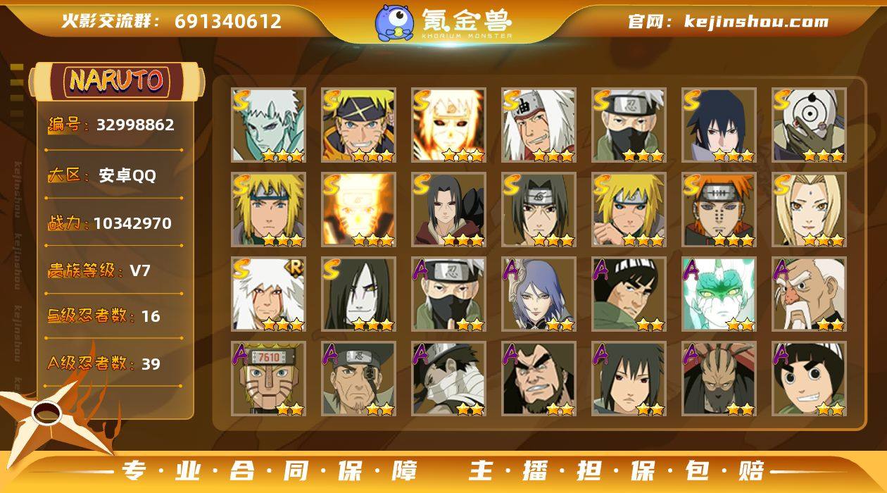 16S忍/39A忍/战力1034W/V7/区服2810 【S忍者】 宇智波带土「十尾人柱力」,宇智波佐助「漩涡鸣人」,宇智波佐助「永恒万花筒」,漩涡鸣人「九喇嘛连结」,自来也「舞之豪杰」,旗木卡卡西「须佐能乎」,自来也「传说中的三忍」,宇智波鼬「秽土转生」,宇智波斑「白面具」,波风水门「秽土转生」,宇智波鼬「须佐能乎」,佩恩「天道」,波风水门,大蛇丸,纲手,波风水门「九喇嘛连结」, 【A忍者】 小南「神驹佑将」,旗木卡卡西「神威对决」,机械鸣人「初始形态」,大野木「侠隐江湖」,巳月「仙人模式」,迈特凯「青春爆炸」,土台「忍界大战」,长十郎「六代目水影」,日向宁次「忍界大战」,漩涡博人「桃式显现」,日向雏田「最终章」,李洛克「忍界大战」,蝎「绯流琥」,宇智波泉奈,神农「羁绊」,桃地再不斩「秽土转生」,长门「青年」,波风水门「青年」,宇智波止水「新春限定」,黑土「四代目土影」,宇智波佐助「须佐能乎」,迪达拉「秽土转生」,旗木卡卡西「忍界大战」,漩涡鸣人「九尾查克拉」,千代「近松十人卫」,秋道丁次「忍界大战」,宇智波佐助「万花筒写轮眼」,志村团藏,奇拉比,旗木卡卡西「万花筒写轮眼」,飞段「死司凭血」,飞段,迪达拉,我爱罗「疾风传」,蝎,干柿鬼鲛,宇智波鼬,猿飞阿斯玛,...