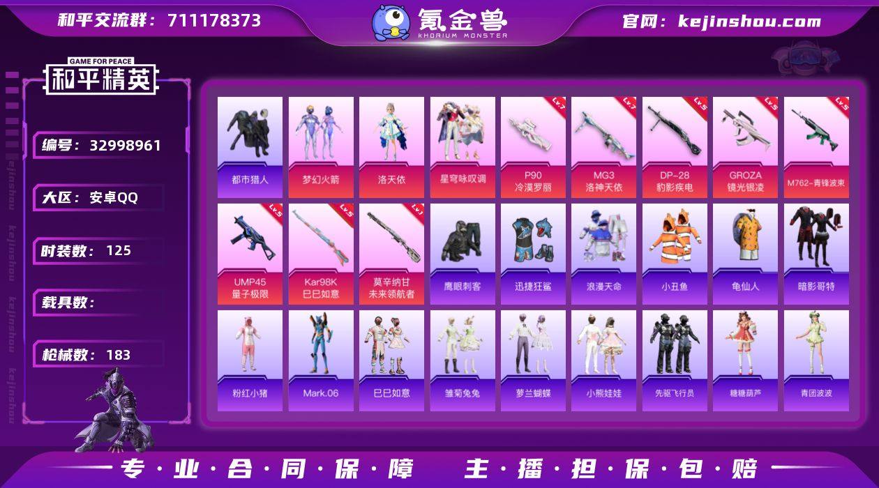 安卓【小号 粉装-梦幻火箭,套装-浪漫天命,套装-都市猎人,套装-暗影哥特,角色-Mark.06,角色-洛天依,UMP45-量子极限(五级),P90-冷漠罗丽(七级)】 手Q-3粉装-9特效枪-0载具-1粉色飞行器-54531热力值-17王牌印记-125套装-183枪皮 【热门品类】:粉装-梦幻火箭,套装-浪漫天命,套装-都市猎人,套装-小丑鱼,套装-龟仙人,套装-暗影哥特,套装-粉红小猪,角色-Mark.06 【粉色套装】:粉装-梦幻火箭,角色-洛天依,粉装-星穹咏叹调 【粉色枪皮等级】:GROZA-镜光银凌(五级),M762-青锋波束(五级),UMP45-量子极限(五级),P90-冷漠罗丽(七级),Kar98K-巳巳如意(五级),Mk14-福马献瑞(一级),莫辛纳甘-未来领航者(一级),DP-28-豹影疾电(五级),MG3-洛神天依(七级) 【粉色枪皮】:GROZA-镜光银凌,M762-青锋波束,UMP45-量子极限,P90-冷漠罗丽,Kar98K-巳巳如意,Mk14-福马献瑞,莫辛纳甘-未来领航者,DP-28-豹影疾电,MG3-洛神天依 【粉色飞行器】:天之羽翼飞行器 【粉色降落伞】:梦幻火箭降落伞,星之彼岸降落伞,洛神天依降落伞,天星战神降落伞,金丰海韵降落伞,幽焰骑士降落伞,冷漠罗丽降落伞 【稀有套装】:套装-龟仙人,套装-巳巳如意,套装-雪国风尚,套装-马上有...