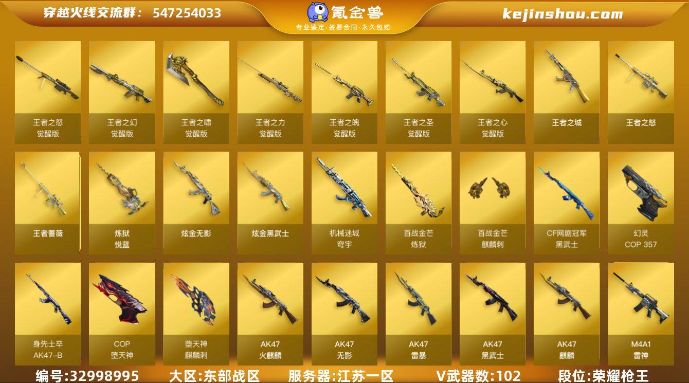 江苏一区-113V-11王者武器数-3炫金武器数 【热门武器】:QBZ03-金色蔷薇,HK417-朱雀,M200-幻神,M200-竞技荣光,死亡之眼,白虎-电玩蓝兔,C.A.T,M4A1-黑骑士*4,汤姆逊-烈龙*5,RPK-盘龙*2,斯泰尔-蝴蝶,火麒麟-绝迹,USP-雷暴*2,COP-堕天神,COP 357-幻灵*3,沙鹰-修罗*4 【王者炫金武器】:王者之城,王者之怒,王者蔷薇,炼狱-悦蓝,炫金无影*2,炫金武士 【音效卡】:屠龙-电竞之星-竞星跃动音效卡,M4A1-黑骑士音效卡,Barrett-毁灭音效卡,HK417-朱雀-电竞之星-竞星跃动音效卡,Barrett-碧霄极光音效卡,炼狱-百战金芒-庆典舞曲音效卡 【皮肤】:幻神-AG-CFPLS17冠军,幻神-AG-CFPL S24冠军 皮肤,QBZ03-AG-CFPLS19冠军,裁决-巅峰荣耀 皮肤,雷神-暗月,雷神-能量核心,雷神-荣耀之魄,M4A1-雷神-CFS 2019,雷神-虎将,雷神-冠军之魄,雷神-R.LGD-CFPLS18冠军,雷神-维纳斯皮肤,M4A1-再燃火线,火麒麟-平天大圣,火麒麟-百城,火麒麟-心动糖果,毁灭-星空,毁灭-冠军之怒,毁灭-SV-CFPLS16冠军,毁灭-黑大圣皮肤,毁灭-百城浙江 皮肤,毁灭-虹光风暴 皮肤,M4A1-千变-孔明皮肤,黑龙-能量核心,黑龙-暗月,黑骑士耀金皮肤,黑骑士-冠军之势,黑骑士-破界 皮肤,...