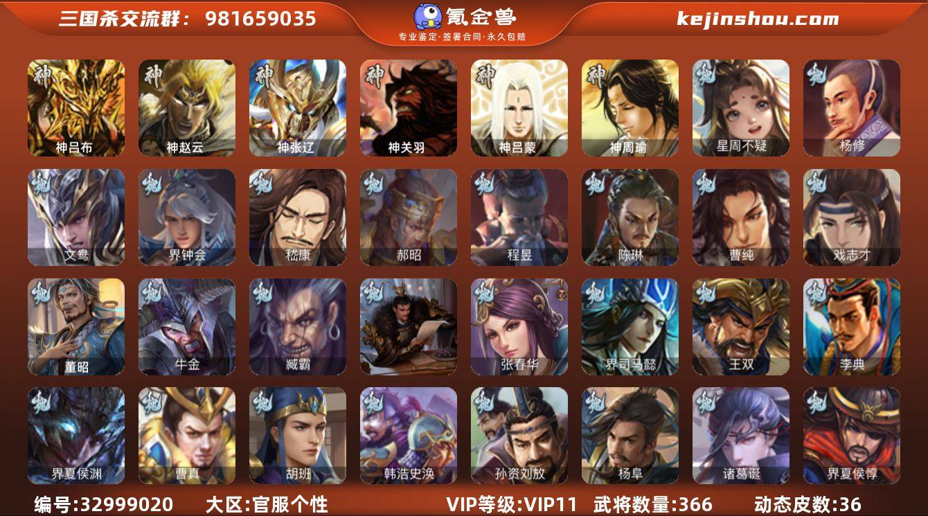 【4813】官阶:大将军;VIP等级:VIP11;史诗武将数量:37;动态皮肤数量:36;武将总数:366;史诗宝珠数量:20;将魂数量:1808;神将:3;魏国史诗武将:16;蜀国史诗武将:8;吴国史诗武将:7;群史诗武将:12