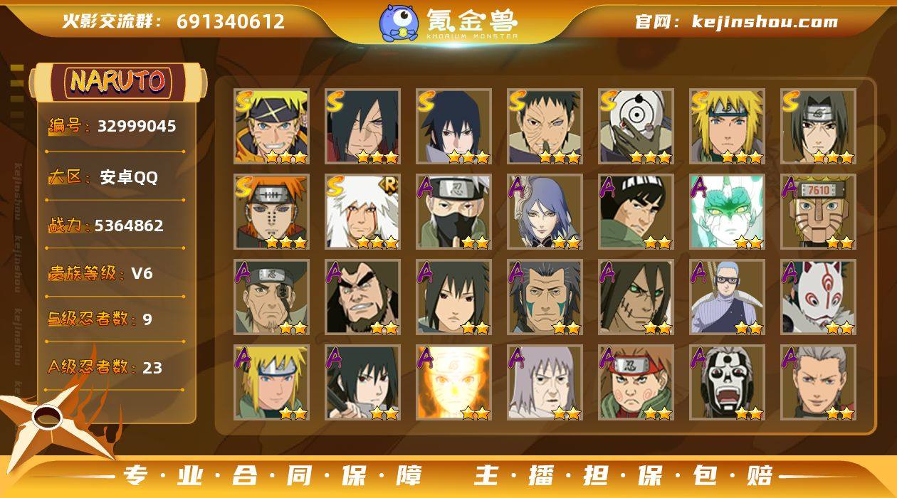 9S忍/23A忍/战力536W/V6/区服3501 【S忍者】 宇智波佐助「漩涡鸣人」,宇智波斑「秽土转生·解」,宇智波佐助「永恒万花筒」,宇智波带土「忍界大战」,自来也「舞之豪杰」,宇智波斑「白面具」,宇智波鼬「须佐能乎」,佩恩「天道」,波风水门, 【A忍者】 小南「神驹佑将」,旗木卡卡西「神威对决」,机械鸣人「初始形态」,巳月「仙人模式」,迈特凯「青春爆炸」,土台「忍界大战」,长十郎「六代目水影」,不动,宇智波泉奈,神农「羁绊」,角都「秽土转生」,神秘面具男「忍者之路」,波风水门「青年」,宇智波佐助「须佐能乎」,漩涡鸣人「九尾查克拉」,千代「近松十人卫」,秋道丁次「忍界大战」,飞段「死司凭血」,飞段,蝎,干柿鬼鲛,猿飞阿斯玛,迈特凯, PX_2540850