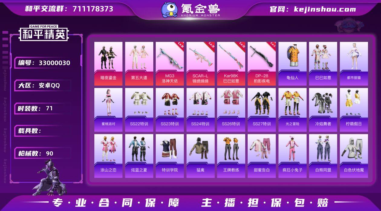 安卓 手Q-3粉装-5特效枪-0载具-0粉色飞行器-27319热力值-2王牌印记-71套装-90枪皮 【热门品类】:套装-龟仙人 【粉色套装】:粉装-暗夜鎏金,粉装-第五大道 【粉色枪皮等级】:SCAR-L-锦绣绵绵(五级),Kar98K-巳巳如意(五级),DP-28-豹影疾电(一级),MG3-洛神天依(六级) 【粉色枪皮】:SCAR-L-锦绣绵绵,Kar98K-巳巳如意,Mk14-福马献瑞,DP-28-豹影疾电,MG3-洛神天依 【粉色降落伞】:恐龙拽拽降落伞,歌者泠鸢降落伞,暗夜鎏金降落伞,第五大道降落伞,圣堂之誓降落伞,精灵梦叶罗丽降落伞 【稀有套装】:套装-龟仙人,套装-巳巳如意,角色-都市丽猫,角色-蜜桃派对,套装-红釉青花 【稀有枪皮】:AKM-彩虹符号,M16A4-幻世战舞者,SCAR-L-炫彩节奏,SCAR-L-红色方程式,M416-糯团青竹,GROZA-懵萌河马,GROZA-田园牧歌,AUG-天降萌叽,AUG-海螺星光,M762-天降萌叽,M762-暗夜鎏金,Mk47-妙红点点,G36C-懵萌河马,AC-VAL-快闪甜心,蜜獾-天降萌叽,UZI-啾咪啾咪,UMP45-仲夏莫吉托,UMP45-涂山之恋,UMP45-蓝色火焰,Vector-焰鹰斗篷,Vector-彩虹符号,Vector-田园牧歌,汤姆逊-暗夜鎏金,汤姆逊-耀粉歌者,MP5K-飒粉甜心,P90-快闪甜心,Kar98K-彩虹符号,Kar98K-洛神...
