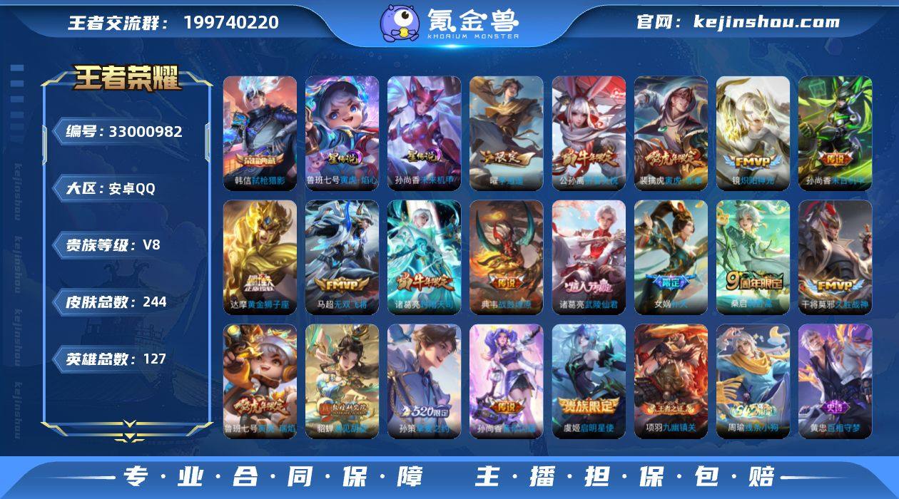 【FTWZ130】【差44342点券升贵族9!打野33段!个性按键10个!王者印记5个!亲密玫瑰251个!紫星币1545个!幸运夺宝15!】安卓Q-V8-最强王者段位-127英雄-244皮肤-1典藏皮肤-18传说-75史诗【英雄全皮】:空空儿全皮【荣耀典藏】:韩信弑枪猎影【传说皮肤】:桑启鸣野蒿,典韦战鼓燎原,孙尚香音你闪耀,马超无双飞将,孙策挚爱之约,女娲补天,裴擒虎寅虎赤拳,鲁班七号寅虎瑞焰,貂蝉遇见胡旋,曜李逍遥 ,公孙离祈雪灵祝,诸葛亮时雨天司,镜炽阳神光,虞姬启明星使,干将莫邪久胜战神,达摩黄金狮子座,诸葛亮武陵仙君,孙尚香末日机甲【限定皮肤】:李白谪仙醉月,狄仁杰阴阳师,赵云皇家上将,墨子神迹守卫,嬴政优雅恋人,嬴政白昼王子,鲁班七号狮舞东方,鲁班七号寅虎瑞焰,庄周高山流水,芈月幻夜卜梦,吕布猎兽之王,夏侯惇朔风刀,夏侯惇匿光决锋者,甄姬女儿国国王,曹操天狼征服者,典韦穷奇,狄仁杰魔术师,狄仁杰万华元夜,达摩星际陆战队,达摩沙漠行僧,项羽海滩派对,老夫子醍醐杖,老夫子航海奇遇记,貂蝉遇见胡旋,程咬金演武夺筹,韩信逐梦之影,韩信傲雪梅枪,兰陵王金庭之子,花木兰青春决赛季,孙悟空大圣娶亲,孙悟空孙行者,牛魔御旌,李元芳云中旅...