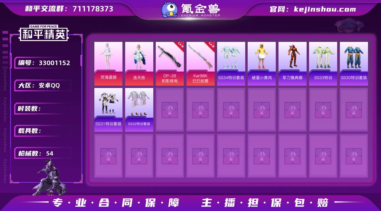 区服:安卓手Q-服饰币:9443-金币:65957-点券:0-当前热力值:14406-王牌次数:2-点券:0 时装:145 枪械:54 装备:51 载具:0 战备:32 6粉装-- 洛天依 荧海星豚 Kar98K-巳巳如意 DP-28-豹影疾电 Mk14-福马献瑞 ACE32-萌骑漫游 破蛋小黄鸡 军刀雅典娜 和平精英账号