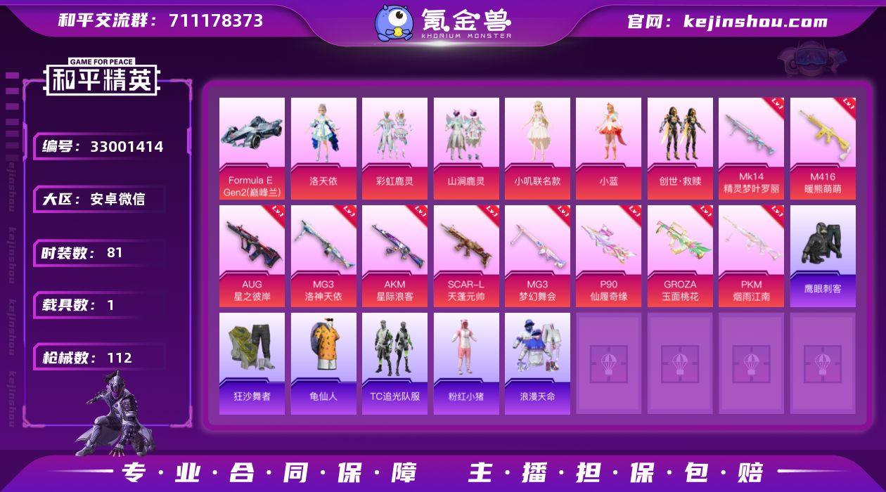 YZJ13297 可二次 安卓V【极品身法枪械素材号 双模式常玩! 地铁满天赋 粉丝logo 2卓越2传奇2绝世 网红伙伴美月兔 7级天蓬元帅 7级狗砸玉面桃花 新版三色螳螂[魂环螳螂] 洛天依 小叽联名 追光队服 满级AUG 】-1稀有1载具9粉装10特效枪12热门81套装112枪皮 44506热力值 9印记 历史绝世王牌21星 【1稀有】 浪漫天命 【1载具】 Formula(巅峰兰) 【9粉装】 觉醒初号机 小蓝 洛天依 小叽联名款 创世救赎 暗夜鎏金 星之彼岸 山涧鹿灵 彩虹鹿灵 【10特效枪】 PKM-江南烟雨 (2级) Mk14-精灵梦叶罗丽 (5级) SCAR-L-天蓬元帅 (7级) AKM-星际浪客 (2级) AUG-星之彼岸 (7级) M416-暖熊萌萌 (5级) GROZA-玉面桃花 (7级) P90-仙履奇缘 (5级) MG3-梦幻舞会 (5级) MG3-洛神天依 (3级) 【12热门】 8号机 Mark.06 龟仙人 鹰眼刺客 追光队服 粉红小猪 狂沙舞者 AWM-激战未来 47-林间仙鹿 Mini14-林间仙鹿 汤姆逊-林间仙鹿 GROZA-林间仙鹿 【2飞行器】 星之彼岸飞行器 林间仙鹿飞行器 【1头盔】 百万伏特头盔 【1背包】 百万伏特背包 营地ID:761879337