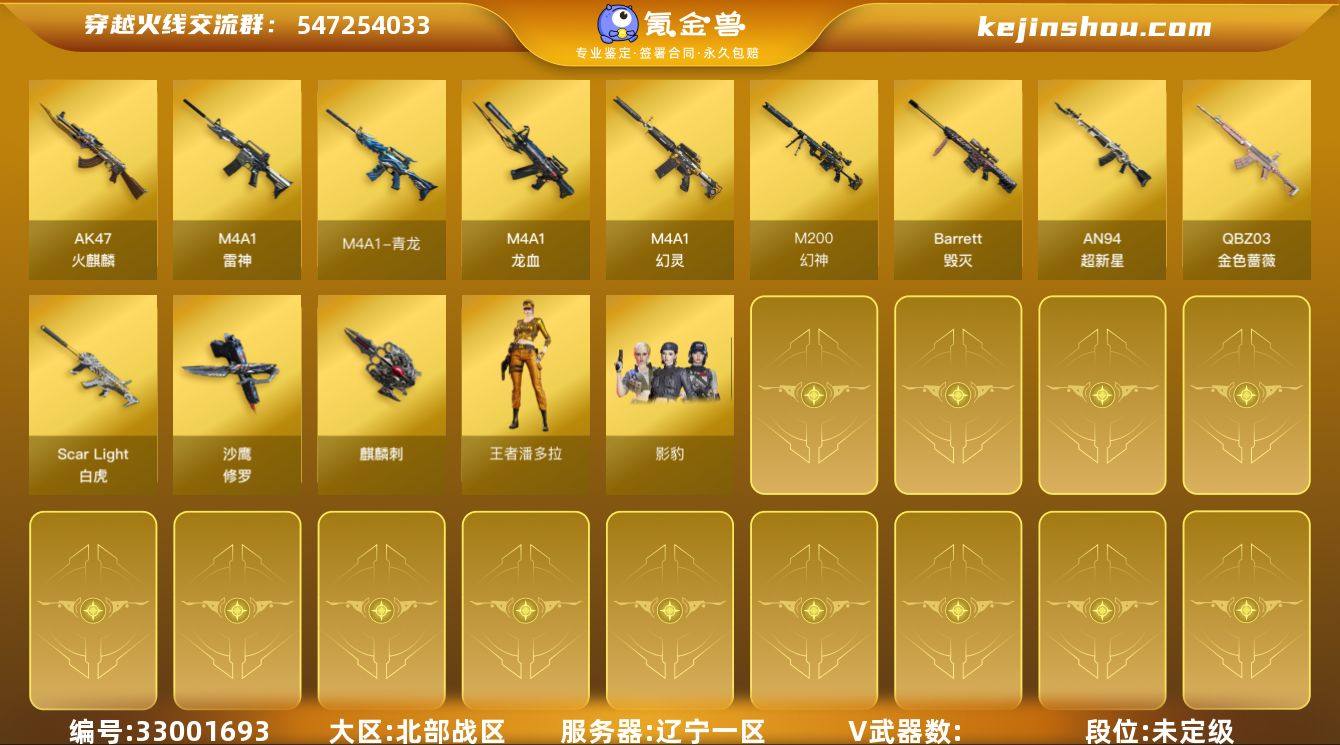 实名: 不可修改 V武器: AK47-火麒麟,M4A1-雷神,M4A1-青龙,M4A1-龙血,Barrett-毁灭,M200-幻神,AN94-超新星,QBZ03-金色蔷薇,Scar Light-白虎,沙鹰-修罗,麒麟刺,M4A1-幻灵,烈火-动感闪耀,天神-动感闪耀,屠龙-动感闪耀,擎天-云海游龙,烈龙-云海游龙,无影-神兵利器,M4A1-赤狱骑士,HK417-朱雀-电竞之星,屠龙-电竞之星,AK47-竞魂无影,屠龙-斗烈龙驹 王者武器: 王者风神-觉醒版 狙击枪稀有皮肤: 天龙-能量核心,幻神-电竞之星 英雄角色: 影豹,职业经理,王者潘多拉,零·纪元 音效道具: 天神动感闪耀音效卡,烈火动感闪耀音效卡,屠龙-电竞之星-竞星跃动音效卡,HK417-朱雀-电竞之星-竞星跃动音效卡