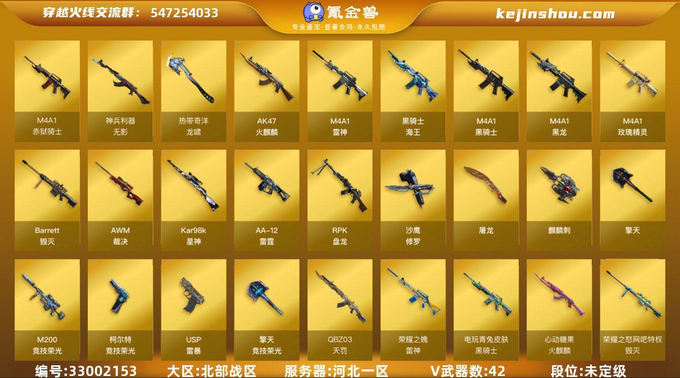 河北一区-45V-2王者武器数-0炫金武器数 【热门武器】:M200-竞技荣光,Kar98K-星神,M4A1-黑骑士,RPK-盘龙,USP-雷暴,沙鹰-修罗*4 【皮肤】:裁决-星际旅行 皮肤,雷神-荣耀之魄,雷神-宇航兔皮肤,火麒麟-心动糖果,毁灭-荣耀之怒,毁灭-青帝,毁灭-魔灵皮肤,毁灭-英雄计划 皮肤,黑骑士-电玩青兔皮肤,炼狱-玩具枪皮肤,屠龙-荣耀之锋,屠龙-春桃 皮肤 【角色】:电竞教官-云悠悠,太空指挥官,斗烈龙骑,芳心审判者,嘉年华灵狐,女主播,潘多拉-X,斯沃特-X,团团 【人偶武器】:AWM-灵狐-15周年嘉年华,生化手雷-机甲核心,迷你艾比 【暴走生化】:超级对讲机 【挑战大师】:AK47-冰龙粉碎者,冰龙粉碎者-白马银枪,神圣爆裂者-末日III 【英雄级武器】:AK47-火麒麟*2,M4A1-黑龙,M4A1-雷神,M4A1-黑骑士,QBZ03-天罚,无影-神兵利器,M4A1-玫瑰精灵,黑骑士-海王,QBZ-03-王者蔷薇-觉醒版,白虎之魄-觉醒版,机械迷城-穹宇,天罚-斗烈龙驹,Barrett-毁灭,AWM-裁决,Kar98K-星神,M200-竞技荣光,RPK-盘龙,AA-12-雷霆,沙鹰-修罗*4,USP-雷暴,柯尔特-竞技荣光,屠龙*2,擎天,麒麟刺,擎天-竞技荣光,龙啸-热带奇洋,屠龙-斗烈龙驹,高爆手雷-竞技荣光*4,闪光弹-...