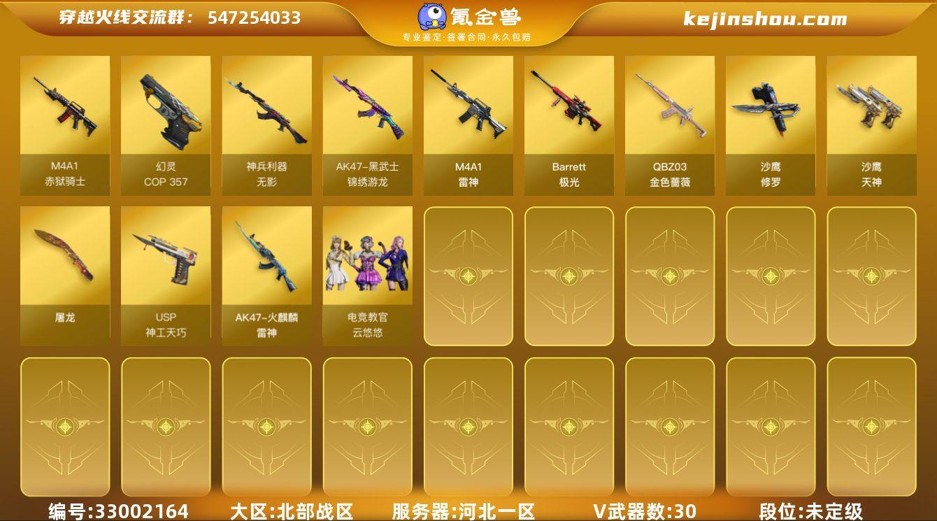 河北一区-32V-3王者武器数-0炫金武器数 【热门武器】:QBZ03-金色蔷薇,死亡之眼,COP 357-幻灵,沙鹰-修罗*2 【皮肤】:雷神-宇航兔皮肤,雷神-源计划2.0专属 皮肤,火麒麟-雷神*2,屠龙-春桃 皮肤 【角色】:电竞教官-云悠悠,零·纪元,战地猎狐,奇洋探员,乔伊教练,修道士,暗夜-X,飞虎队-X,风暴女,嘉年华灵狐,0号玩家,灵狐者-X,灵狐者-七夕宝贝,龙儿-小淘气,麻雀,曼陀罗-X,潘多拉-X,潘多拉-甜心教官,斯沃特-X,蜀雪,影武者-X 【人偶武器】:AWM-灵狐-15周年嘉年华,生化手雷-机甲核心,深渊终结者手雷,迷你超能女侍 【暴走生化】:死亡之眼,超级对讲机 【挑战大师】:神圣爆裂者-末日III 【英雄级武器】:M4A1-雷神*2,无影-神兵利器,黑武士-锦绣游龙,QBZ03-金色蔷薇,机械迷城-穹宇,Barrett-极光,王者风神-觉醒版,沙鹰-修罗*2,沙鹰-天神*2,COP 357-幻灵,USP-神工天巧,屠龙,高爆手雷-幻灵*2,高爆手雷-竞技荣光*2,高爆手雷-神工天巧*2,手雷-热带奇洋,高爆手雷-雷暴王者,闪光弹-幻灵*2,闪光弹-竞技荣光,闪光弹-神工天巧,闪光弹-雷暴王者,烟雾弹-幻灵,烟雾弹-竞技荣光*2,烟雾弹-神工天巧,M4A1-赤狱骑士 【其他武器】:源-千变,源·火...
