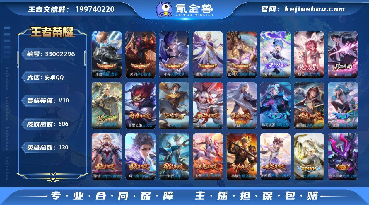 【王者荣耀】珍品无双0 典藏6 无双3 珍品传说1 传说62 史诗155 英雄130 皮肤506 贵族10级 荣耀典藏:天鹅之梦|武则天|神鉴启示录|赤影疾锋|鸣剑·曳影|倪克斯神谕__无双皮肤:群星魔术团|时之魔女|青丘·九尾__珍品传说:朽木白哉__传说皮肤:鸣野蒿|前尘镜|深海之息|无双飞将|挚爱花嫁|挚爱之约|绛天战甲|炽阳神光|启明星使|地狱之眼|地狱火|海洋之心|仲夏夜之梦|云霓雀翎|久胜战神|黄金狮子座|狄仁杰-超时空战士|黄金射手座|猫影幻舞|刘备-时之恋人|一念神魔|云鹰飞将|冠军飞将|飞鸢探春|李逍遥|游龙清影|淬星耀世|炽翼辉光|浮生妄|孙尚香-末日机甲|齐天大圣|白虎志|凤求凰|铠-琥珀纪元|零号·赤焰|落雪白狼|吕布-曦玄引|马超-琥珀纪元|怒海麟威|祈雪灵祝|诗剑行|时雨天司|碎云|太华|貂蝉-曦玄引|项羽-无限倾心|小乔-音你心动|永恒水手月亮|永曜之星|虞姬-无限倾心|逐花归海|乘龙·淬吴钩|乘龙·铭钟鼎|乘龙·问璇玑|云缨-鹤归松栖|觅芳踪|山海·苍雷引|山海·炽霜斩|寅虎·赤拳|幻光神枪|神树通天__稀有限定:寅虎·展翼|寅虎·心曲|奔雷神使|御风骁将|至尊宝|瑞麟志|青龙志|朱雀志|虞姬-霸王别姬|大圣娶亲|引擎之心|岱宗|飞衡|蔷薇恋人|奇迹圣诞|虎魄|神威|烈魂|龙胆|乒乒小将|孙行者|猪悟...
