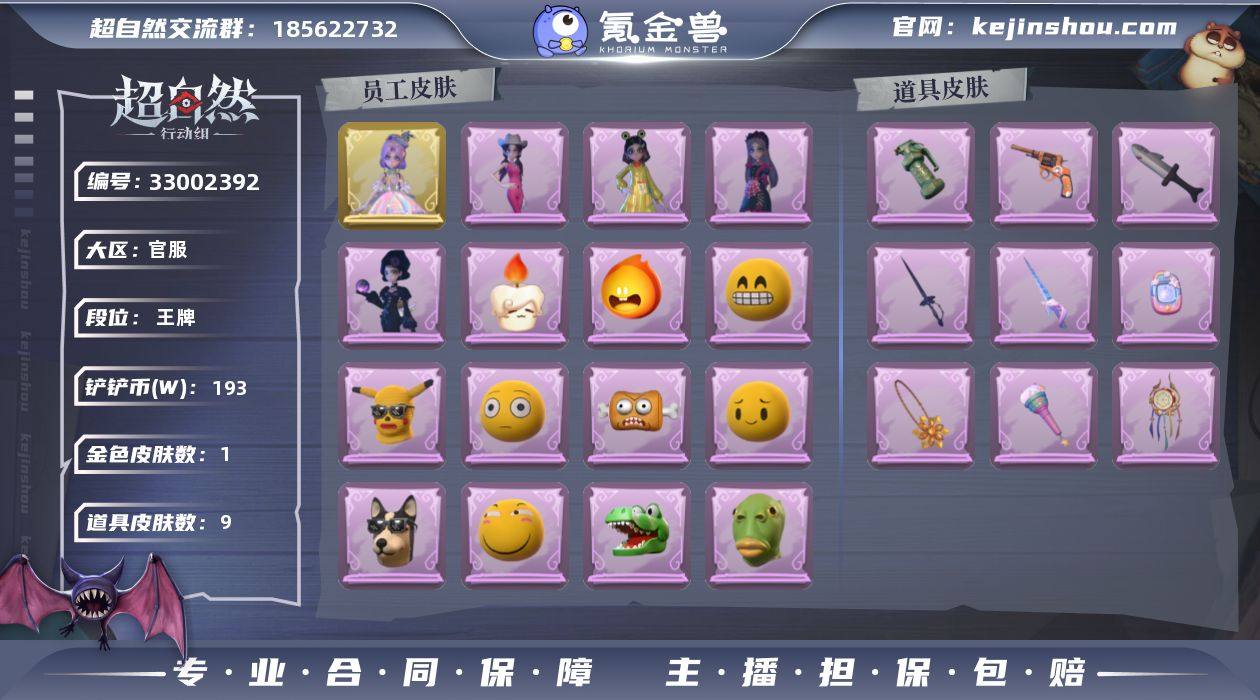 金色皮肤数量: 1 紫色皮肤数量: 4 道具皮肤数量: 9 段位: 王牌 外观: 遗失的童话,丝缕哀歌,黑月挽歌,嘻嘻头套,烈焰红唇头套,呆滞头套,炙热烧烤,卑微头套,哈士奇头套,滑稽头套,鳄霸天头套,鱼头怪头套,面具马头套,萨卡班甲鱼头套,驼半仙头套,云梦之星,未竟乐园,小小玛丽,呱呱雨衣,火爆了头套,耀眼的你,烛光纪念,牛啤背包