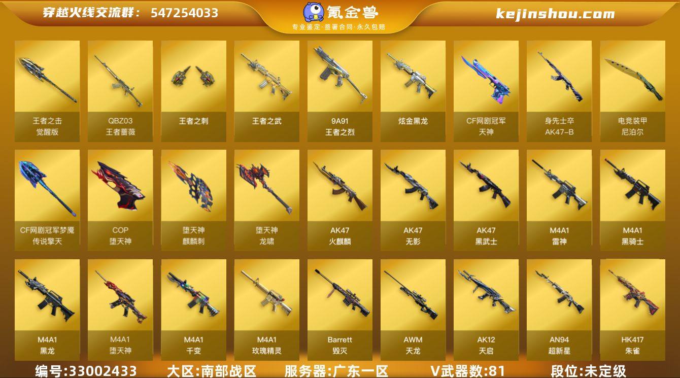 广东一区-89V-8王者武器数-2炫金武器数 【热门武器】:QBZ03-金色蔷薇,HK417-朱雀,QBZ-03-王者蔷薇,牛牛-AK47,M4A1-黑骑士,汤姆逊-烈龙,RPK-盘龙,加特林-炼狱*2,COP-白鲨,COP-堕天神*2,沙鹰-修罗*5 【王者炫金武器】:王者之武,王者之烈,QBZ-03-王者蔷薇,王者之刺,闪光弹-雷霆王者,炫金骑士,炫金黑龙 【音效卡】:M4A1-黑骑士音效卡,QBZ03-金色蔷薇音效卡 【皮肤】:白虎-AG-CFPLS20冠军,金色蔷薇-枪娘阿敏 皮肤,雷神-暗月,雷神-宠儿-2019MVP,火麒麟-雷神,火麒麟-轻羽皮肤,火麒麟-斗烈龙驹 皮肤,毁灭-暗月,毁灭-英雄计划 皮肤,无影-能量核心,战神-粉色甜心皮肤,战神-紫绶金章皮肤,战神-流金岁月皮肤,AK47-B-常胜将军-曹操,AK47-B-常胜将军-孙权,极光-能量核心,天神-暗月*2 【角色】:零,葵,魅影,迷迭香,审判者,王者玲珑,狐影,奇洋探员,乔伊教练,修道士,云海玲珑,暗夜-X,芳心审判者,嘉年华灵狐,娟娟,葵-赛博朋克,兰-新年限定,兰妹妹,零-水下丽影,灵狐者-职业经理,潘多拉-X,潘多拉-甜心教官,蛇姬,蜀雪,铁骑荣耀,兔囡囡,新娜塔莎,影武者-X 【人偶武器】:COP-白鲨,巴雷特-零-水下丽影,AWM-灵狐-15周年嘉年华,牛...