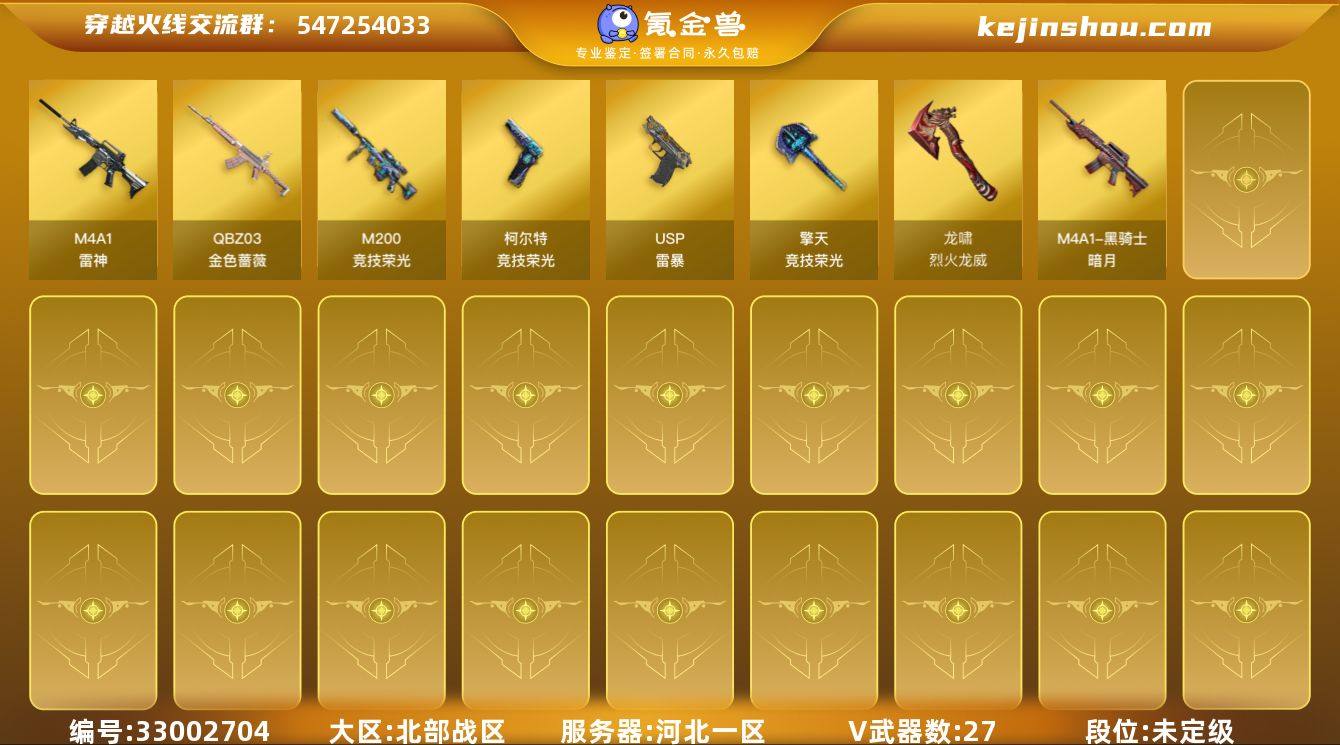 河北一区-29V-0王者武器数-0炫金武器数 【热门武器】:QBZ03-金色蔷薇,M200-竞技荣光,USP-雷暴 【音效卡】:屠龙-电竞之星-竞星跃动音效卡,HK417-朱雀-电竞之星-竞星跃动音效卡,炼狱-百战金芒-庆典舞曲音效卡,柯尔特-百战金芒-庆典舞曲音效卡 【皮肤】:M4A1-再燃火线,雷神-神秘按键 皮肤,黑骑士-暗月,轻型军用手斧-再燃火线 【角色】:葵-阿尔法武装,幻面灵狐,暗夜-X,初恋灵狐,芳心审判者,风暴女,零-水下丽影,灵狐者-X,灵狐者-黄金海岸,潘多拉-X,潘多拉-甜心教官,团团 【人偶武器】:夺魂 【挑战大师】:激光毁灭者III-白马银枪*2 【英雄级武器】:M4A1-雷神,QBZ03-金色蔷薇,HK417-朱雀-电竞之星,M200-竞技荣光,炼狱-百战金芒,USP-雷暴,柯尔特-竞技荣光,擎天-竞技荣光,麒麟刺-百战金芒,屠龙-电竞之星,龙啸-烈火龙威,高爆手雷-竞技荣光*4,闪光弹-竞技荣光*5,烟雾弹-竞技荣光*4 【其他武器】:AK47-火麒麟-猫爪,源·雷神*2,魂·M4A1-雷神-化蛇,魂·雷神-神秘按键,魂·雷神-新春神龙*2,御·雷神-机甲刑天,雷神-赛博幻想,魂·黑骑士-现代金属,魂·黑武士-锋芒破茧,源·武圣,魂·龙血-锋芒破茧*2,灵·HK417-朱雀-甜蜜火力,金色蔷薇-狼王*2,魂·...