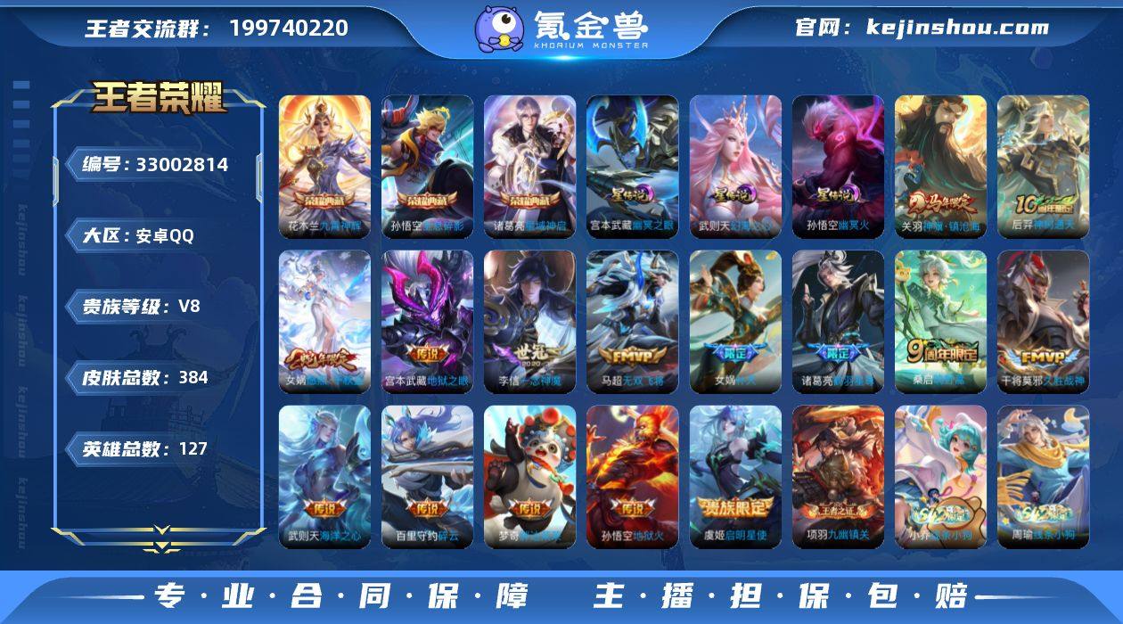 【精品推荐·1.1W金标元歌·九霄神辉·星域神启·全息碎影·神骥镇沧海·愿照千秋盛·鹤羽星尊·碎云·补天·无双飞将·一念神魔·无二次包过】YXw22907-安卓Q-127英雄-384皮肤-20王者印记-300铭文-贵族积分5w【贵族8】【3典藏·3星传说·15传说·4按键】【因赛季更新游戏段付以上号为准!】 【英雄全皮】:孙权全皮,女娲全皮,狂铁全皮,敖隐全皮,蒙恬全皮,空空儿全皮,影全皮 【荣耀典藏】:孙悟空全息碎影,诸葛亮星域神启,花木兰九霄神辉 【星元皮肤】:孙悟空幽冥火,宫本武藏幽冥之眼,武则天幻海之心 【传说皮肤】:关羽神骥镇沧海,后羿神树通天,女娲愿照千秋盛,桑启鸣野蒿,诸葛亮鹤羽星尊,百里守约碎云,马超无双飞将,女娲补天,虞姬启明星使,李信一念神魔,干将莫邪久胜战神,梦奇胖达荣荣,宫本武藏地狱之眼,孙悟空地狱火,武则天海洋之心 【限定皮肤】:白起狰,蒙犽顽岩魄,蔡文姬夏日便利店,大乔绒语心约,虞姬夏日便利店,姜子牙天穹之誓,李白谪仙醉月,狄仁杰阴阳师,虞姬凯尔特女王,赵云皇家上将,墨子神迹守卫,嬴政白昼王子,孙尚香蔷薇恋人,鲁班七号狮舞东方,庄周高山流水,高渐离玩趣恶龙,钟无艳超时空战士,芈月重明,吕布猎兽之王,周瑜赤莲之焰,元...