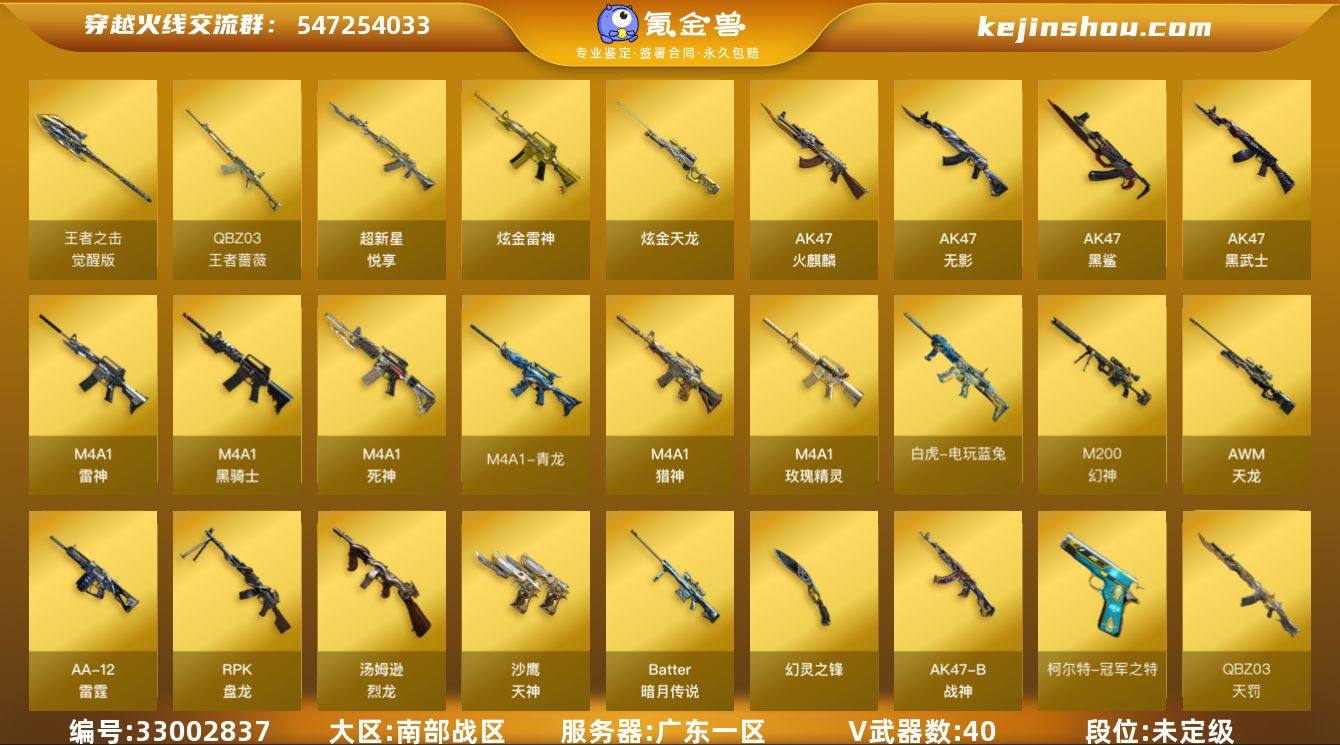 广东一区-46V-6王者武器数-2炫金武器数 【热门武器】:M4A1-青龙,M200-幻神,QBZ-03-王者蔷薇,白虎-电玩蓝兔,柯尔特-冠军之特,M4A1-黑骑士,汤姆逊-烈龙,RPK-盘龙 【王者炫金武器】:超新星-悦享,QBZ-03-王者蔷薇,高爆手雷-雷霆王者,烟雾弹-雷霆王者,炫金雷神,炫金天龙 【音效卡】:QBZ03-天罚音效卡,屠龙-电竞之星-竞星跃动音效卡,M200-幻神音效卡,M4A1-黑骑士音效卡,HK417-朱雀-电竞之星-竞星跃动音效卡 【皮肤】:幻神-降龙,幻神-动感闪耀 皮肤,白虎-电玩粉兔皮肤,雷神-星空,雷神-杨戬,雷神-动感闪耀 皮肤,毁灭耀金皮肤 【角色】:关小雨,机械姬,不败狙神,王者零-华冠丽服,王者炫,乔伊教练,修道士,云海玲珑,幻面灵狐,斗烈龙骑,飞虎队-X,风暴女,虎妞,嘉年华灵狐,潘多拉-X,潘多拉-甜心教官,王者-零-传说之路,影武者-X,游珑儿,团团 【人偶武器】:AWM-灵狐-15周年嘉年华*2,迷你超能女侍 【挑战大师】:AK47-冰龙粉碎者,阐释者III 【英雄级武器】:AK47-火麒麟,M4A1-雷神,M4A1-黑骑士,AK47-无影,M4A1-死神,AK47-黑武士*2,AK47-黑鲨,M4A1-青龙,QBZ03-天罚,FAMAS G2-天戎,M4A1-玫瑰精灵,M4A1-猎神*2,烈火-动感闪耀,王者之...