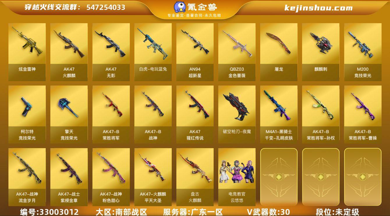 广东一区-31V-0王者武器数-1炫金武器数 【热门武器】:QBZ03-金色蔷薇,M200-竞技荣光,死亡之眼,白虎-电玩蓝兔 【王者炫金武器】:炫金雷神 【皮肤】:火麒麟-平天大圣*2,火麒麟-盘古,M4A1-千变-孔明皮肤,战神-粉色甜心皮肤,战神-紫绶金章皮肤,战神-流金岁月皮肤*3,AK47-B-常胜将军-曹操,AK47-B-常胜将军-孙权*2 【角色】:电竞教官-云悠悠,斗烈龙骑,芳心审判者,风暴女,葵-赛博朋克,灵动武士,灵狐者-七夕宝贝,龙儿-小淘气,潘多拉-X,樱-战斗天使,影武者-X 【人偶武器】:COP-旗袍,迷你深渊冰龙,夺魂,深渊终结者手雷,迷你超能女侍 【暴走生化】:死亡之眼,超级对讲机 【挑战大师】:激光毁灭者III,试炼破坏者III 【英雄级武器】:AK47-火麒麟,AK47-无影,AN94-超新星*3,QBZ03-金色蔷薇,AK-47-猩红传说,AK47-B-战神,AK47-B-常胜将军,白虎-电玩蓝兔,天罚-斗烈龙驹,M200-竞技荣光,柯尔特-竞技荣光,破空枪刃-夜魔,屠龙,麒麟刺,擎天-竞技荣光,屠龙-斗烈龙驹,高爆手雷-竞技荣光*3,闪光弹-竞技荣光*3,烟雾弹-竞技荣光*3 【其他武器】:源·雷神,雷神-赛博幻想,源·毁灭,御·炼狱-女娲,魂·修罗-现代金属,魂·天神-宇航兔兔 【道具】:炫彩背...