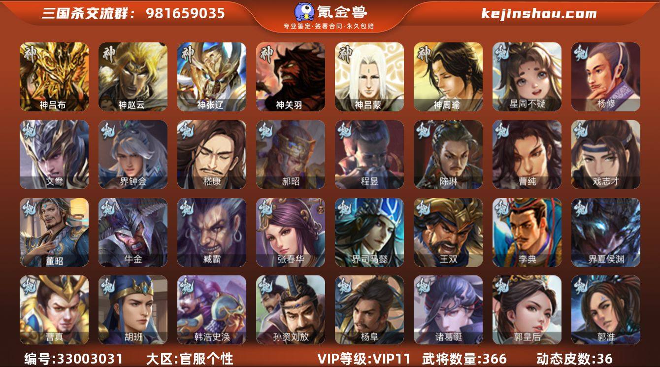 官阶:大将军;VIP等级:VIP11;史诗武将数量:37;动态皮肤数量:36;武将总数:366;史诗宝珠数量:20;将魂数量:1808;神将:3;魏国史诗武将:16;蜀国史诗武将:8;吴国史诗武将:7;群史诗武将:12