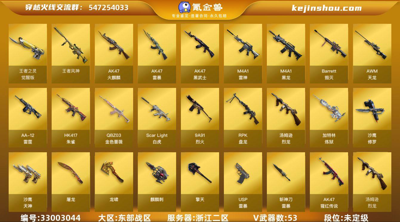 浙江二区-57V-3王者武器数-0炫金武器数 【热门武器】:QBZ03-金色蔷薇,Scar Light-白虎,HK417-朱雀,死亡之眼,汤姆逊-烈龙*5,RPK-盘龙,加特林-炼狱,斯泰尔-蝴蝶,USP-雷暴,沙鹰-修罗,金刚伞 【王者炫金武器】:王者风神,高爆手雷-雷霆王者 【音效卡】:AK47-火麒麟音效卡 【皮肤】:雷神-耀金皮肤,火麒麟-华夏之心,火麒麟-轻羽皮肤,火麒麟-心动糖果,毁灭-星空,毁灭-英雄计划 皮肤,黑武士-典韦皮肤,龙啸-幻灵之哮 皮肤 【角色】:葵,春,王者涂鸦,风暴女,嘉年华灵狐,兰-新年限定,灵动武士,零-水下丽影,灵狐者-X,潘多拉-X,潜龙队-X,青霞仙子,斯沃特-X,兔囡囡,影武者-X,游珑儿,团团,雅典娜 【人偶武器】:斯泰尔-蝴蝶,AWM-灵狐-15周年嘉年华,COP-旗袍 【暴走生化】:死亡之眼 【挑战大师】:神圣爆裂者III,神圣爆裂者-末日III 【英雄级武器】:AK47-火麒麟*2,M4A1-黑龙,M4A1-雷神,AK47-黑武士,AK47-雷暴,HK417-朱雀,Scar Light-白虎,QBZ03-金色蔷薇,9A91-烈火,AK-47-猩红传说,AWM-天龙,Barrett-毁灭,RPK-盘龙,加特林-炼狱,汤姆逊-烈龙*5,AA-12-雷霆,沙鹰-修罗,沙鹰-天神*2,USP-雷暴,王者之灵-觉醒版,屠龙*2,龙啸,擎天...