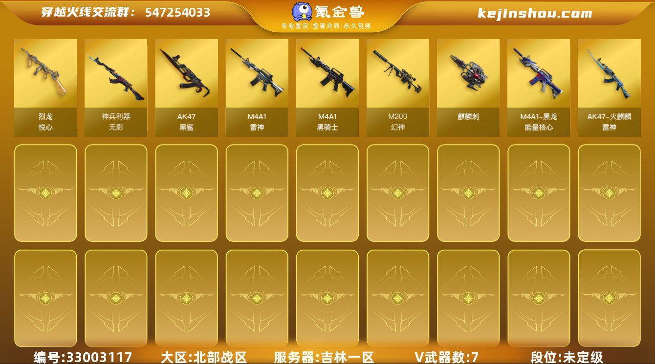 吉林一区-7V-1王者武器数-0炫金武器数 【热门武器】:M200-幻神,M4A1-黑骑士 【王者炫金武器】:烈龙-悦心 【皮肤】:火麒麟-雷神,黑龙-能量核心 【角色】:嘉年华灵狐,潘多拉-甜心教官,新娜塔莎 【人偶武器】:AWM-灵狐-15周年嘉年华,生化手雷-机甲核心 【挑战大师】:AK47-冰龙粉碎者,神圣爆裂者-末日III 【英雄级武器】:M4A1-雷神,M4A1-黑骑士,AK47-黑鲨,无影-神兵利器,M200-幻神,麒麟刺,闪光弹-幻灵 【源级武器】:源·火麒麟*2,火麒麟-雷神,源-黑龙,源·雷神*3,魂·雷神-诺拉,魂·雷神-神秘按键,魂·雷神-维纳斯,魂·雷神-新春神龙,魂·雷神-15周年嘉年华,M4A1-十二生肖·龙-雷神,源·黑骑士,魂·黑骑士-破浪10年*2,御·黑骑士-冰魄,御·黑骑士·哪吒闹海,源·天启,源·超新星,源·青龙,魂·HK417-朱雀-凤灵,源-金色蔷薇,源·天龙*3,魂·裁决-凤灵,魂·裁决-羽掣,魂·毁灭-青帝,源·Barrett-朱雀,灵·Barrett-朱雀-炫光,魂·炼狱-月,魂·修罗-15周年嘉年华,源·天神,魂·屠龙-春桃,魂·龙啸-秦师 【道具】:夺命之镰,防化服,金色流光-枪王排位*2,星辰流光-枪王排位,枪王排位28赛季金色流光,枪王排位29赛季金色流光,防弹头盔*5,防弹衣*5,C4工具钳*3...