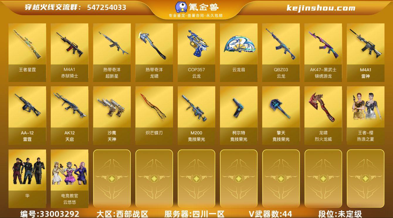 四川一区-44V-2王者武器数-0炫金武器数 【热门武器】:M200-竞技荣光,C.A.T,加特林-炼狱,5-炽火炎龙,裁决-雪莉杨,炽芒蝶刃 【王者炫金武器】:王者星霆 【皮肤】:雷神-宇航兔皮肤,雷神-源计划2.0专属 皮肤 【角色】:电竞教官-云悠悠,华,王者樱-热浪之夏,奇洋探员,乔伊教练,芳心审判者,飞虎队-X,风暴女,娟娟,猎狐者-追月,灵狐-花神,灵狐者-X,灵狐者-七夕宝贝,曼陀罗-X,玫瑰花神,潘多拉-X,蜀雪,兔囡囡,夜玫瑰-幻能朋克,游珑儿 【人偶武器】:裁决-雪莉杨,5-炽火炎龙,迷你地狱终结者,AWM-灵狐-15周年嘉年华,C.A.T,迷你牛牛,迷你生化手雷,生化手雷-机甲核心 【暴走生化】:超级对讲机 【挑战大师】:冰龙粉碎者-白马银枪 【英雄级武器】:M4A1-雷神*2,AK12-天启,QBZ03-云龙,黑武士-锦绣游龙,超新星-热带奇洋,王者之势-觉醒版,机械迷城-穹宇,M200-竞技荣光,加特林-炼狱,AA-12-雷霆,沙鹰-天神,柯尔特-竞技荣光,COP 357-云龙,擎天-竞技荣光,炽芒蝶刃,龙啸-热带奇洋,屠龙-斗烈龙驹,龙啸-烈火龙威,云龙扇,高爆手雷-竞技荣光,高爆手雷-云龙*7,手雷-热带奇洋,闪光弹-竞技荣光,闪光弹-云龙*7,烟雾弹-竞技荣光,烟雾弹-云龙*7,...