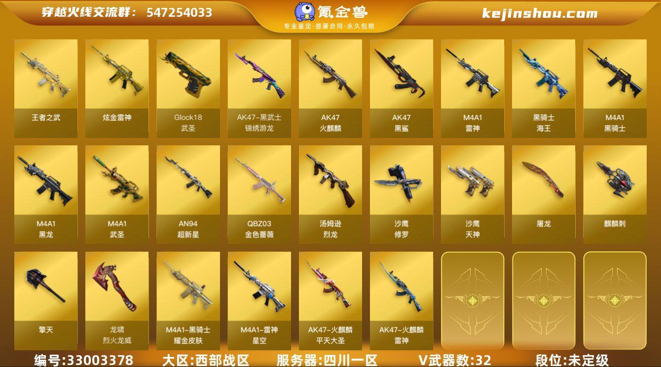 四川一区-32V-1王者武器数-1炫金武器数 【热门武器】:QBZ03-金色蔷薇,死亡之眼,M4A1-黑骑士,汤姆逊-烈龙,加特林-炼狱,沙鹰-修罗*9 【王者炫金武器】:王者之武,炫金雷神 【皮肤】:雷神-星空*2,火麒麟-雷神*3,火麒麟-平天大圣*2,黑骑士耀金皮肤 【角色】:嘉年华灵狐,潘多拉-X,铁骑荣耀,兔囡囡,影武者-X,游珑儿,职业选手 【人偶武器】:M4A1-雷神-精英刀锋,AWM-灵狐-15周年嘉年华*2,生化手雷-机甲核心,灵狐娃娃手雷 【暴走生化】:死亡之眼 【英雄级武器】:AK47-火麒麟,M4A1-黑龙,M4A1-雷神,M4A1-黑骑士,AN94-超新星,M4A1-武圣,AK47-黑鲨*2,黑武士-锦绣游龙,QBZ03-金色蔷薇,黑骑士-海王,加特林-炼狱,汤姆逊-烈龙,沙鹰-修罗*9,沙鹰-天神,Glock18-武圣,屠龙*4,擎天*2,麒麟刺,龙啸-烈火龙威 【源级武器】:源·火麒麟*4,火麒麟-雷神*3,源-黑龙,御·黑龙-龙太子*2,源·雷神*5,魂·雷神-维纳斯,魂·雷神-新春神龙,魂-雷神-萌杀,魂·雷神-15周年嘉年华,魂·雷神-萌柴,御·雷神-机甲刑天*2,御·雷神-烈虎,M4A1-十二生肖·龙-雷神*3,雷神-赛博朋克,御·雷神-葫芦兄弟,御·雷神-小白龙*2,源·黑骑士*2,魂·黑骑士-现代金属*3,魂·黑骑士-幻能...