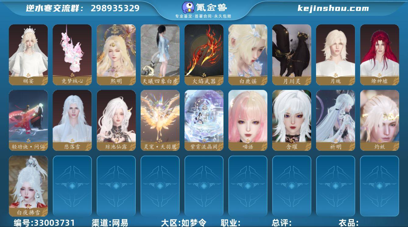 【区服】 游园惊梦 【充值称号】 卧看千山 【已用天赏石】 28 【天霓染数量】 3 【天霓染】 晴蓝逸思*1, 夜绸袍*1, 陆离*1 【转盘外观】 灼妖, 枕星 【稀有道具】 未用天赏石 【天赏发型】 喵语, 斓宴, 蔚海, 含曜, 月魄, 燎神墟, 祈明, 悲落雪, 熙明, 琼池仙露, 白鹿谣 【天赏祥瑞】 紫霄流晶阙, 月川灵 【天赏外观】 火焰武器, 竞梦绒心, 轻功诀问仙, 天曦四象·白虎 【天赏灵宠】 灵宠·天羽凰 【副本外观】 白夜拂雪*2, 飞焰流波, 紫宿宸极, 重海遥思, 星剑分野, 霜途无间 【配饰】 天逆珠·妄索, 天丝织夜, 犯逆鳞, 烟波渺 【商城外观】 晴蓝逸思, 星弈玄夜, 甜宙漫游, 野径风途, 砂城宝阙, 居居勇者, 元夕浮焰, 狂纵驰野, 墨喧雪绒, 时隙旅者, 雾都往事, 绯魂寄川, 雾蓝星瞳, 靛蓝沉汐, 纯白月光, 盛浪晴海, 焦糖暖绒, 羽信絮梦, 烹椒听雀, 青羽惊梦, 幻韵游乐, 冥渊, 云绣露华, 白凤御羽, 拂新柳, 归墟化神, 司玄镇天, 天离渊青, 血宴风华, 鸿福昭运, 神戬天威, 朝歌旧梦, 玲珑灼火, 诗剑纵歌, 千星咏叹, 闻鹤九皋, 跃动心芒, 朔雪从风, 琼林萧瑟, 川峦游墨, 云汉逢夕, 玄喵夜行, 鳞纱幻海, 斗战凌空, 鳞骨逢幽, 乌夜禁巡, 星宫遐音, 贪狼摄星, 青林雀舞, 开阳执戈, 紫微...