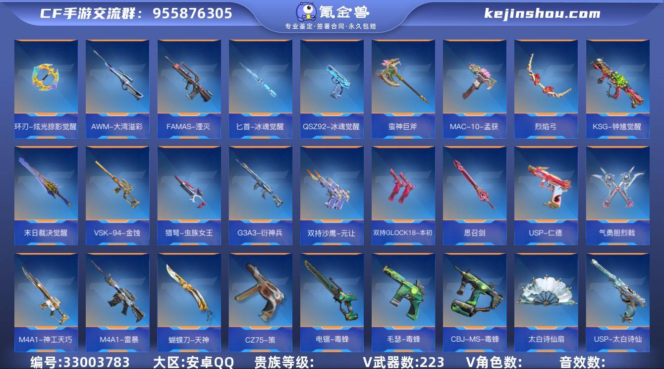 CFM20772|【安卓QQ】 角色等级:大元帅 【角色】关小雨、晴雅、樱、职场灵狐-赛事经理、零-新生、月神-X、刀锋-枪战王者 【武器】王者之蝶、王者之霆、王者之影、王者之心、王者之狱、王者之魂、KSG-孟获、加特【安卓QQ】 角色等级:大元帅 【角色】关小雨、晴雅、樱、职场灵狐-赛事经理、零-新生、月神-X、刀锋-枪战王者 【武器】王者之蝶、王者之霆、王者之影、王者之心、王者之狱、王者之魂、KSG-孟获、加特林-炼狱、CZ75-策、双管猎枪-文远、双管猎枪-威侯、柯尔特-仲达、USP-仁德、双持GLOCK18-本初、气勇胆烈戟、思召剑、铁锹-孟德、M200-幻神、AWM-天龙、巴雷特-极光、98K-黑骑士、M4A1-雷神、M4A1-雷暴、M4A1-太白诗仙、M4A1-神工天巧、AUG-机械纪元、CBJ-MS-毒蜂、汤姆逊-烈龙、寒霜烈龙、毛瑟-毒蜂、USP-太白诗仙、蝴蝶刀-天神、丛林匕首-庆龙觉醒、电锯-毒蜂、太白诗仙扇、迷你饕餮、RPK-盘龙、M4A1-死神、加特林-堡垒觉醒、地狱烈炎、双持沙鹰-元让、G3A3-衍神兵、FAMAS-湮灭、KSG-钟馗觉醒、AWM-大湾溢彩、VSK-94-金蚀、猎弩-虫族女王、烈焰弓、MAC-10-孟获、QSZ92-冰魂觉醒、环刃-炫光掠影觉醒、末日裁决觉醒、蛮神巨斧、匕首-冰魂觉醒、AN94-盖、81式-光明之神、...