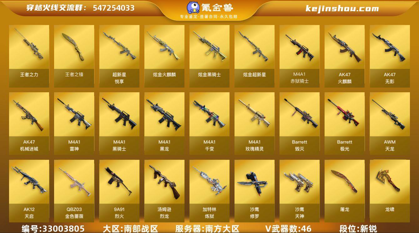 南方大区-51V-4王者武器数-3炫金武器数 【热门武器】:QBZ03-金色蔷薇,M4A1-黑骑士*2,汤姆逊-烈龙*5,加特林-炼狱*2,沙鹰-修罗*6 【王者炫金武器】:超新星-悦享,王者之力,王者之锋,炫金火麒麟,炫金骑士,炫金超新星 【音效卡】:Barrett-毁灭音效卡 【皮肤】:雷神-暗月,毁灭-星空,毁灭-英雄计划 皮肤,M4A1-千变-孔明皮肤,黑龙-暗月,无影-能量核心,天龙-能量核心,极光-能量核心,修罗-能量核心 【角色】:零,樱,毒蝰术士,零·纪元,空,兰-新年限定,零-水下丽影,萌儿,潘多拉-甜心教官,铁骑荣耀,影武者-X,团团 【暴走生化】:超级对讲机 【挑战大师】:冰龙粉碎者-白马银枪,神圣爆裂者-末日III 【英雄级武器】:M4A1-千变,AK47-火麒麟*2,M4A1-黑龙,M4A1-雷神*2,M4A1-黑骑士*2,AK47-无影,AK12-天启,AK47-机械迷城,M4A1-玫瑰精灵,QBZ03-金色蔷薇,9A91-烈火,AK-47-猩红传说*2,AWM-天龙,Barrett-毁灭,Barrett-极光,加特林-炼狱*2,炼狱-悦蓝-觉醒版,汤姆逊-烈龙*5,沙鹰-修罗*6,沙鹰-天神,屠龙*2,龙啸,擎天*3,麒麟刺*2,尼泊尔-雷霆,高爆手雷-雷霆,闪光弹-雷霆,烟雾弹-雷霆,烟雾弹-竞技荣光,M4A1-赤狱骑士,AN94-竞魂超新星 【...