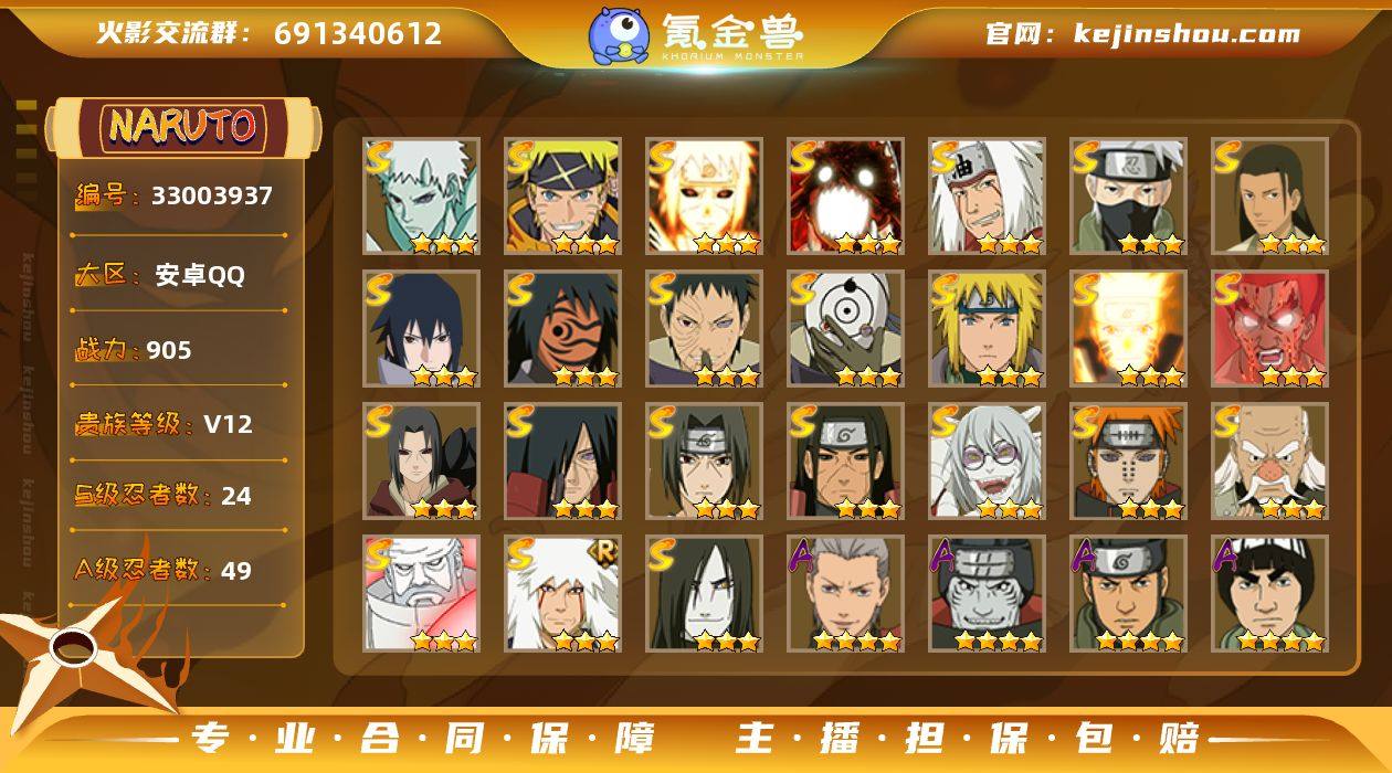 【HYYH1357】V12/战力905W/S忍24/A忍49/三星S-宇智波斑「秽土转生」/四星A-干柿鬼鲛/三星S-波风水门「九喇嘛连结」/三星S-宇智波带土「十尾人柱力」/二星A-达鲁伊「五代目雷影」/二星A-飞段「死司凭血」/三星S-旗木卡卡西「须佐能乎」/2星小南「神驹佑将」/二星A-照美冥「五代目水影」/二星A-奇拉比「忍界大战」/三星S-千手柱间·木叶创立/二星A-神秘面具男 「忍者之路」/2星旗木卡卡西「神威对决」/三星S-药师兜「仙人模式」/二星A-长十郎「六代目水影」/三星A-蝎「绯流琥」/三星S-漩涡鸣人 「暴怒·第六尾」/二星A-桃地再不斩「秽土转生」/三星S-宇智波斑「白面具」/三星S-迈特凯「死门」/三星S-自来也 「传说中的三忍」/二星A-佩恩·六道「漂泊浪客」/二星A-宇智波带土「暴怒」/二星A-黑土「四代目土影」/二星A-迪达拉「秽土转生」/二星A-神农 「羁绊」/二星A-宇智波佐助「万花筒写轮眼」/二星A-迪达拉/二星A-漩涡鸣人「九尾查克拉」/二星A-日向宁次·忍界大战/二星A-宇智波带土「漂泊浪客」/二星A-宇智波鼬/三星S-宇智波佐助「永恒万花筒」/三星S-大筒木金式「博人传」/三星S-宇智波鼬「秽土转生」/二星A-长门「青年」/二星A-桃地再不斩/三星S-宇智波带土 「忍界大战」/二星A-...