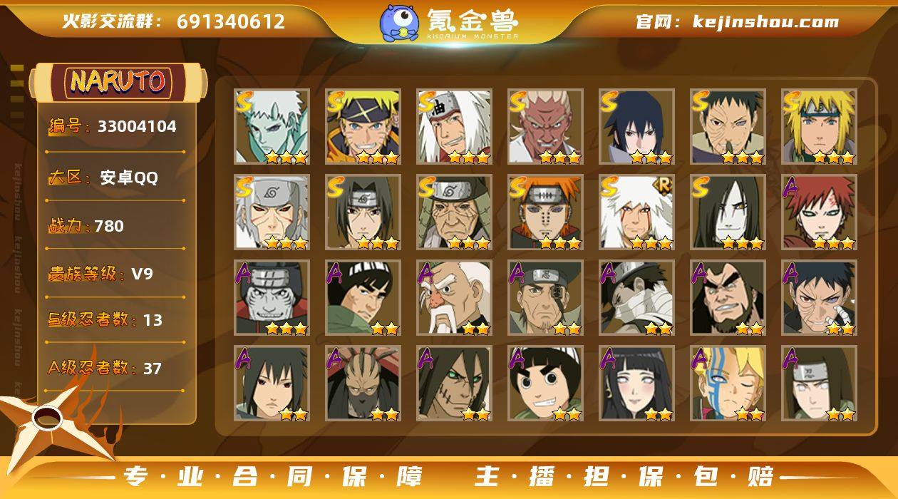 【HYYH1375】V9/战力780W/S忍13/A忍37/二星A-大野木「侠隐江湖」/三星S-宇智波带土「十尾人柱力」/二星A-达鲁伊「五代目雷影」/二星A-飞段「死司凭血」/2星小南「神驹佑将」/三星S-猿飞日斩「秽土转生」/二星A-猿飞阿斯玛「秽土转生」/三星S-千手扉间「秽土转生」/三星A-干柿鬼鲛/二星A-神秘面具男 「忍者之路」/2星旗木卡卡西「神威对决」/二星A-长十郎「六代目水影」/二星A-蝎「绯流琥」/二星A-桃地再不斩「秽土转生」/三星S-自来也 「传说中的三忍」/二星A-佩恩·六道「漂泊浪客」/二星A-宇智波带土「暴怒」/二星A-飞段/二星A-神农 「羁绊」/二星A-猿飞阿斯玛/二星A-宇智波佐助「万花筒写轮眼」/二星A-不缘/二星A-大蛇丸「晓」/二星A-日向宁次·忍界大战/二星A-宇智波带土「漂泊浪客」/二星A-宇智波鼬/三星S-宇智波佐助「永恒万花筒」/二星A-迈特凯/三星S-宇智波带土 「忍界大战」/二星A-蝎/三星S-佩恩「天道」/三星S-漩涡鸣人·宇智波佐助/三星S-波风水门/二星A-角都「秽土转生」/二星A-漩涡博人「桃式显现」/二星A-小南「夏日泳装」/三星A-我爱罗「疾风传」/二星A-李洛克「忍界大战」/二星A-土台「忍界大战」/二星A-波风水门 「青年」/三星S-自来也「舞之豪杰」/2星迪达拉「...