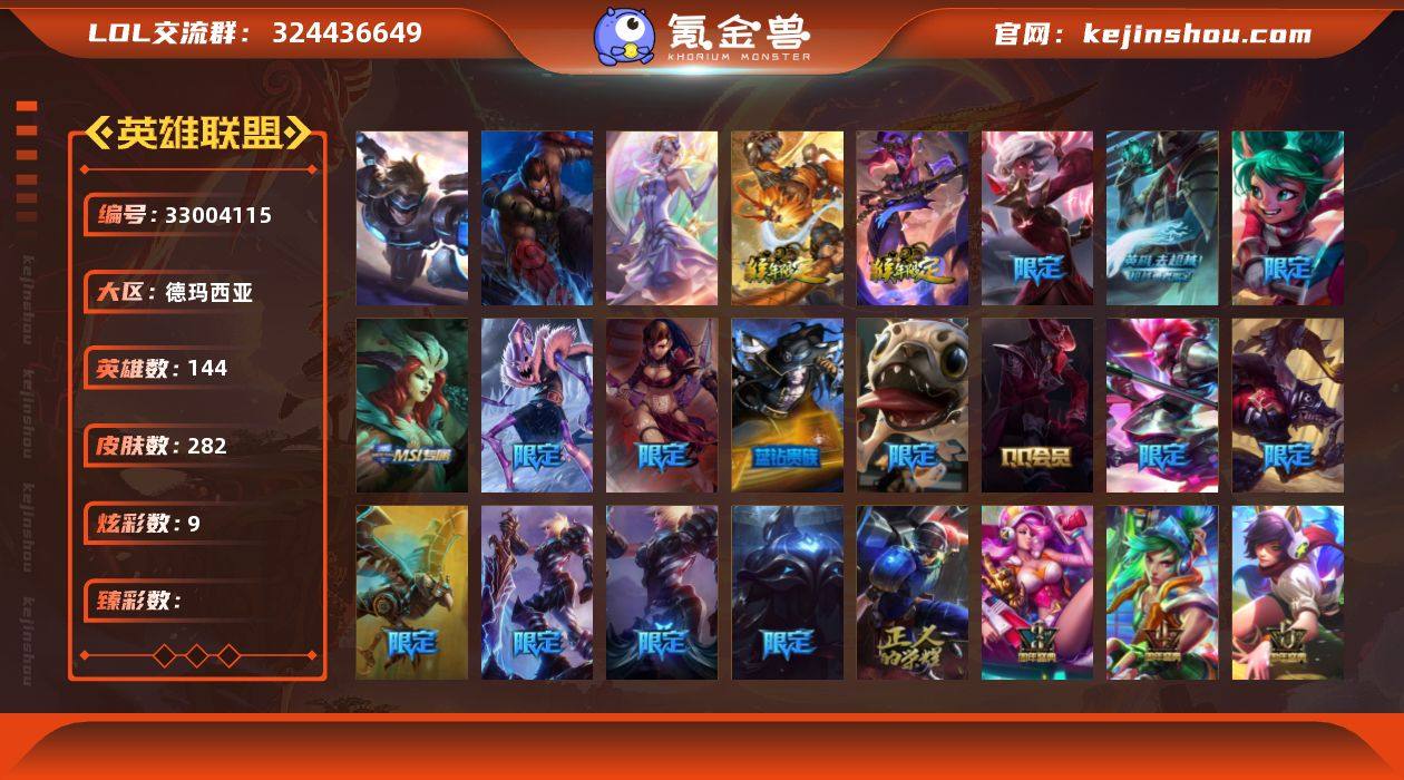 【LOLYH2076】144英雄/282皮肤/3终极/57限定/9炫彩/27传说/72史诗/未定级账号等级:51/美猴王 孙悟空/玉净夜叉 凯特琳/甜心宝贝 安妮/圣诞开心鬼 提莫/圣诞糖果棒 厄运小姐/“主人不要我了” 阿木木/胡桃夹子 小丑/平安夜女神 娑娜/英勇玩具兵船长/冰雪节 茂凯/冬季仙境 发条/雪默丁格/圣诞老人 酒桶/圣诞老人 布隆/冰雪节 马尔扎哈/冰雪节 格雷福斯/冰雪女神 辛德拉/冰雪兽 纳尔/大元素使/灵魂守卫/未来战士/地底世界 崔斯特/冠军之刃 锐雯/冠军之刃 锐雯 2016/冠军之隐 劫/S1FNC 酒桶/S2 暗杀星 蒙多/S2 暗杀星 努努/S3 SKT T1 贾克斯/S3 SKT T1 劫/S3 SKT T1 李青/S4 SSW 图奇/S5 SKT T1 阿利斯塔/S5 SKT T1 阿兹尔/S5 SKT T1 滑板鞋/S5 SKT T1 蜘蛛/3周年 厄运小姐/4周年 锐雯/5周年 阿狸/胜利女神 希维尔/胜利之树 茂凯/海贼 瑞兹/灵魂收割者 索拉卡/鬼影重重 魔腾/糖果使徒 费德提克/泳池派对 格雷福斯/泳池派对 雷克顿/泳池派对 李青/蓝色忧郁 崔斯特/女猎手 希维尔/波比的巧克力工坊/永恒之森 乐芙兰/勇者阿狸/电玩战魂 赫卡里姆/都铎王朝 图奇/钢铁之翼 艾尼维亚/红桃杰克 崔斯特/征服者 卡尔玛/防暴天使 凯尔/克格汪/魔幻卡牌 崔斯特/邪鸦魅影 乐芙兰/源计划:林 易/霸...