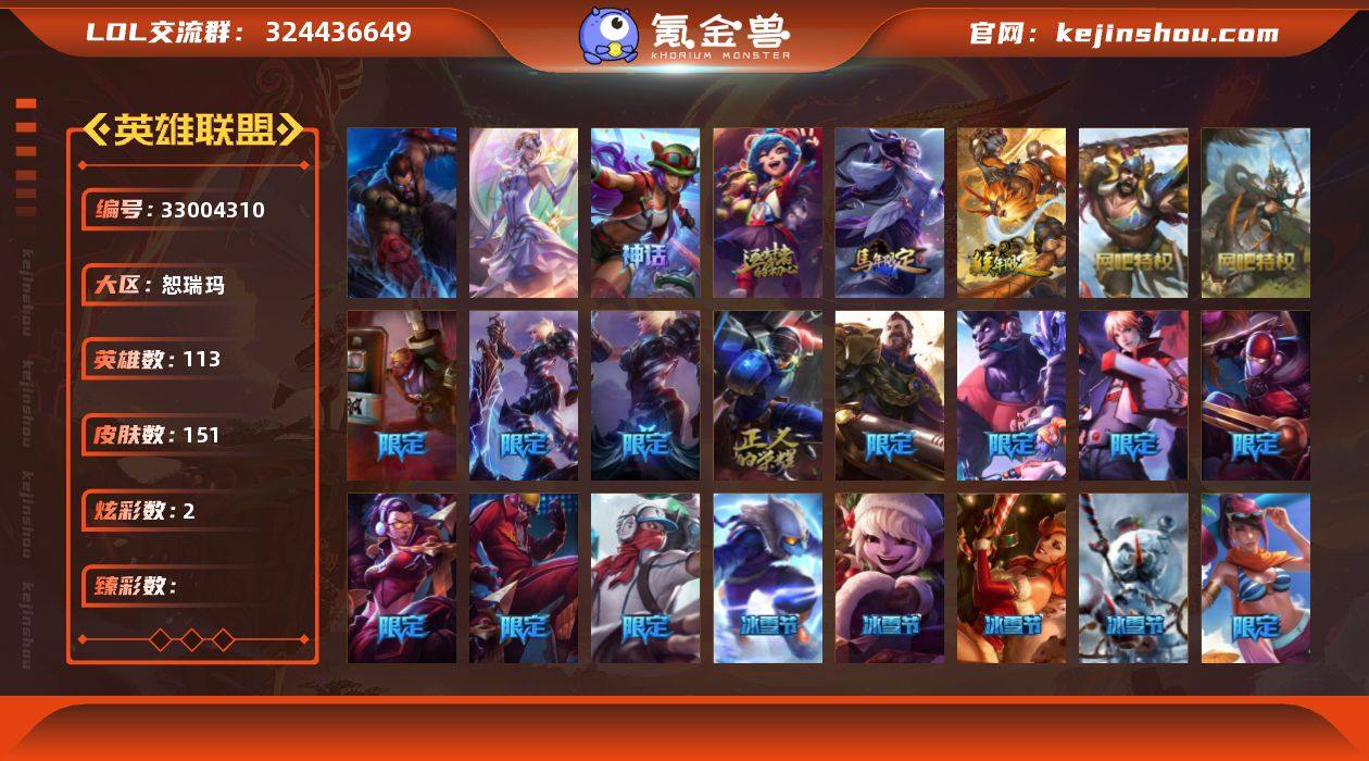 【LOLYH2056】113英雄/151皮肤/2终极/2神话/26限定/2炫彩/27传说/39史诗/未定级/10周年 安妮/十五周年纪念 希维尔/广寒仙子 嫦娥/美猴王 孙悟空/圣诞精灵 崔丝塔娜/圣诞糖果棒 厄运小姐/冰雪节 茂凯/雪默丁格/冰雪节 炼金/冰雪节 马尔扎哈/大元素使/灵魂守卫/冠军之刃 锐雯/冠军之刃 锐雯 2016/S2 暗杀星 蒙多/S2 暗杀星 伊泽瑞尔/S3 SKT T1 劫/S3 SKT T1 李青/S3 SKT T1 薇恩/S4 SSW 炼金/胜利枪神 格雷福斯/南瓜头 费德提克/鬼影重重 魔腾/鬼影森森 茂凯/泳池派对 菲奥娜/泳池派对 李青/野兽猎人 瑟庄妮/野兽猎人 泰达米尔/防暴士兵 辛吉德/防暴天使 凯尔/地狱之门卫士 加里奥/邪鸦魅影 乐芙兰/战场女武神 凯尔/源计划:林 易/合金巨兽 努努和威朗普/源计划:联合 艾希/恶魔之刃 泰达米尔/鬼魂新娘 莫甘娜/双重冰晶 艾尼维亚/黯晶凤凰 艾尼维亚/律政大亨 蒙多/电玩女神 娑娜/冰霜之刃 艾瑞莉娅/最终BOSS 维迦/苹果机器人 布里茨/地狱行者 孙悟空/神拳 李青/银河魔装机神 兰博/第三类接触 黑默丁格/黎明使者 锐雯/黯黑魔龙 希瓦娜/焰尾妖狐 阿狸/女校长 菲奥娜/泳池派对 吉格斯/霸天异形 卡兹克/灌篮高手 德莱厄斯/星之守护者 金克丝/特战先锋 赵信/翼骑统领 赵信/屠龙勇士...