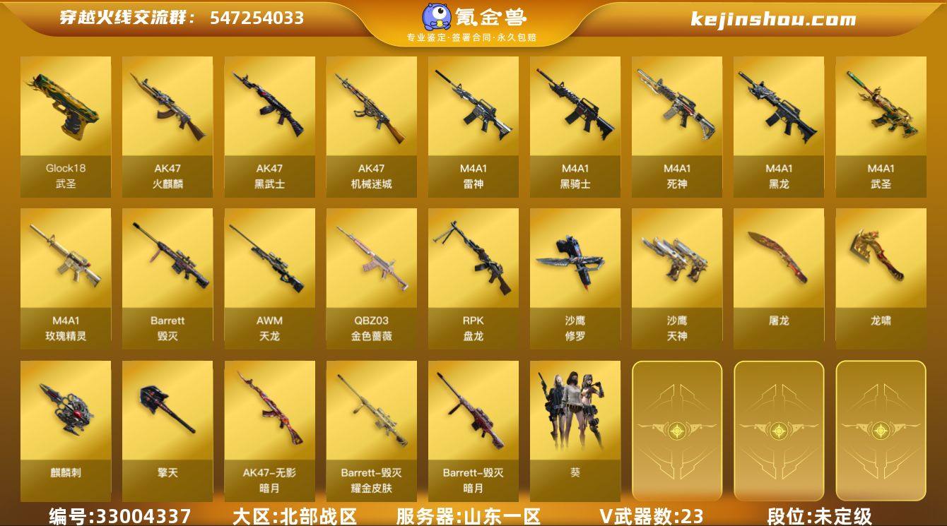 山东一区-24V-0王者武器数-0炫金武器数 【热门武器】:QBZ03-金色蔷薇,死亡之眼*2,C.A.T,M4A1-黑骑士,RPK-盘龙,沙鹰-修罗*2 【音效卡】:M4A1-黑骑士音效卡 【皮肤】:毁灭-暗月*2,毁灭耀金皮肤,无影-暗月*2,死神-秘银*3,天神-暗月*2 【角色】:葵,团团 【人偶武器】:C.A.T 【暴走生化】:死亡之眼*2 【挑战大师】:激光毁灭者III 【英雄级武器】:AK47-火麒麟,M4A1-黑龙,M4A1-雷神,M4A1-黑骑士,M4A1-死神,AK47-黑武士,M4A1-武圣,AK47-机械迷城,M4A1-玫瑰精灵*2,QBZ03-金色蔷薇,AWM-天龙,Barrett-毁灭,RPK-盘龙,沙鹰-修罗*2,沙鹰-天神,Glock18-武圣,屠龙*2,龙啸,擎天,麒麟刺 【源级武器】:源·火麒麟,源·雷神,魂·雷神-诺拉,源·机械迷城,源·HK417-朱雀,源·天龙,魂·毁灭-神秘黑洞 【道具】:炫彩背包,绿色巨人,灵魂忍者,变异宝贝,迷雾幽灵,夺命之镰,防化服*2,防弹头盔*2,防弹衣*2,C4工具钳*2,手雷包*2 【特殊枪械】:1黑骑士,1盘龙
